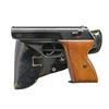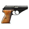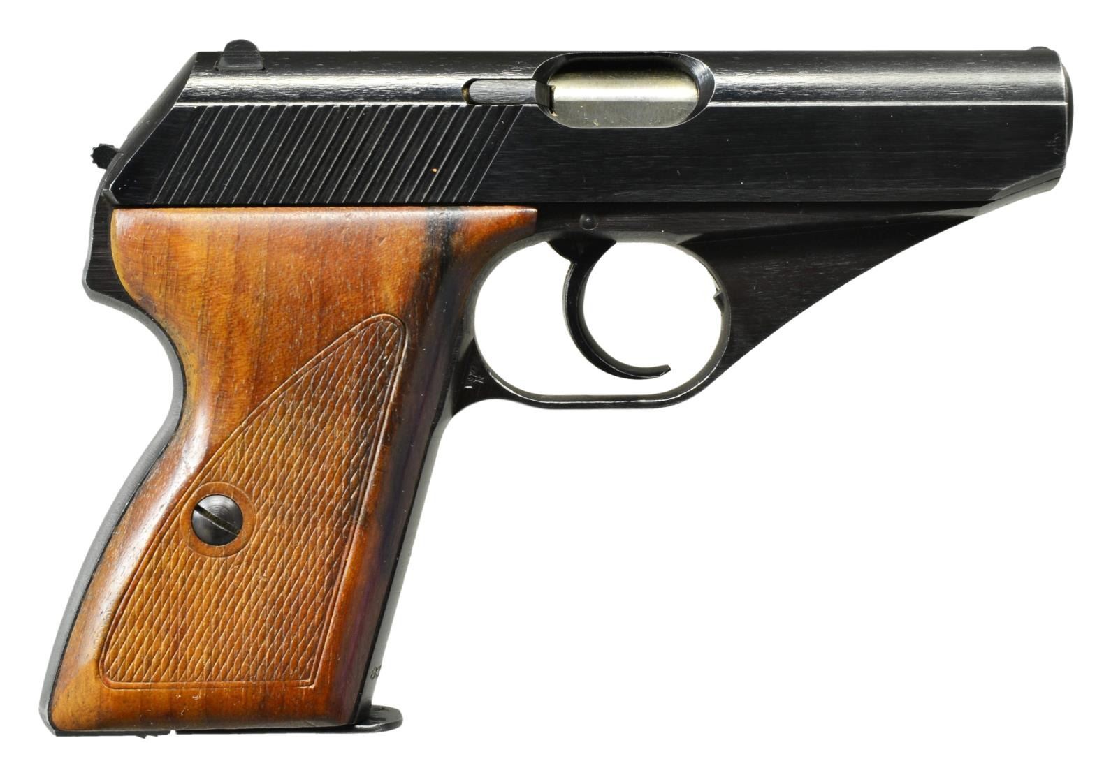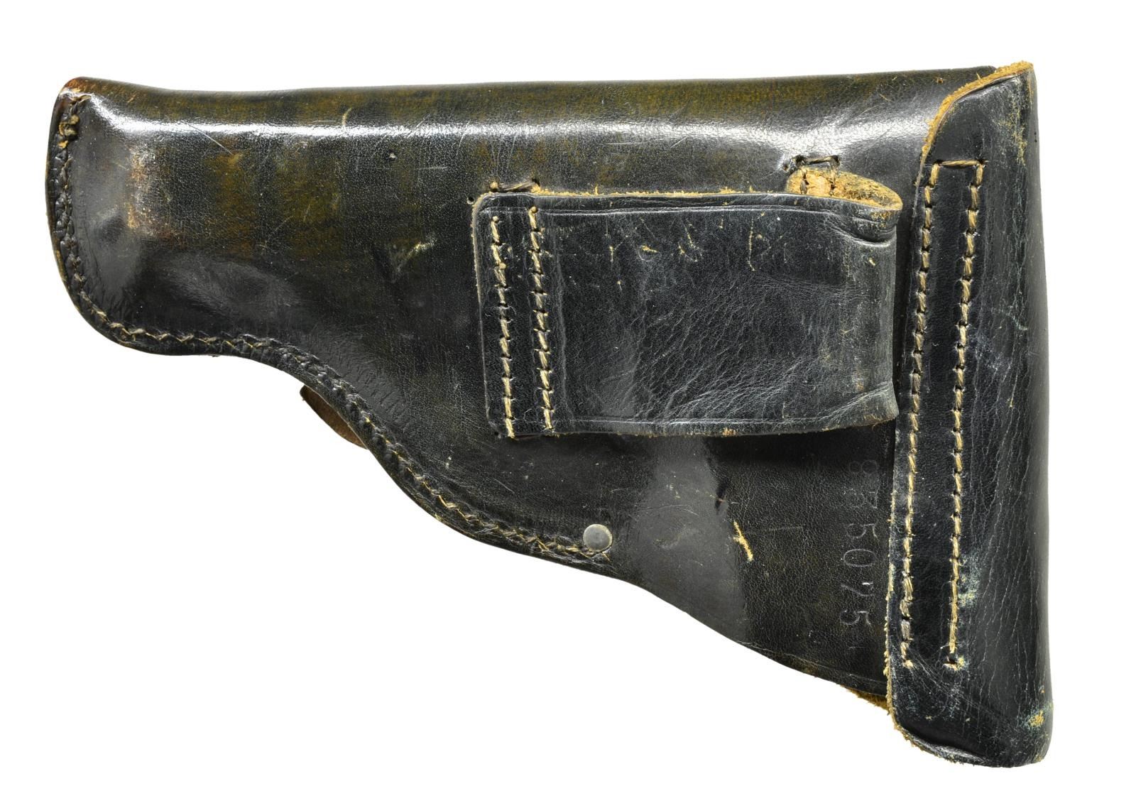 Cal. 7.65mm (32 ACP). S# 835075. Bbl. 3.4". Early police variation w/ eagle L on left side of trigger guard plus eagle N on right side & also on right front of slide; no other marks or proofs. Checkered walnut grips. MAGS: 2 good matching numbered 8 rd., additionally marked 1 & 2. Gray toned bodies w/ cleaned peppery oxidation; very good blued floorplates. UNATTACHED ACCESSORIES: 1 good plus black flap holster w/ matching # of pistol on back. Spare mag. pouch on front w/ maker's mark to left of pouch: "SCHAMBACH & Co. / BERLIN / 1942 / Eagle party symbol". CONDITION: exceptional very good to near excellent appearance w/ lightest of thinning on high edges at front of slide from holstering. Great appearance of in the white bbl. at port & no signs of operation wear but very light gray tone on left side at muzzle w/ slide retracted. Near excellent bore & grips. Collector quality example w/ 2 matching mags. plus matching holster. Feed ramp & breech face have unfired appearance. (22-78/NW). CURIO. $800-1,200.