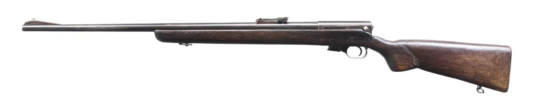 Cal. 22 LR. S# 114165. Barrel 25.5". Ramp mounted blade front sight & 300m tangent rear sight. Grooved receiver with rotating safety. Replacement walnut stock with sling swivels. MAGS: 1 later replacement Model 45 5 rd. mag. CONDITION: brown/ gray patina on metal with areas of pitting on left side of barrel. Stock has worn finish with large cracks. Bore has strong rifling, some shine & areas of pitting. (24-6921/MD). CURIO. $150-225