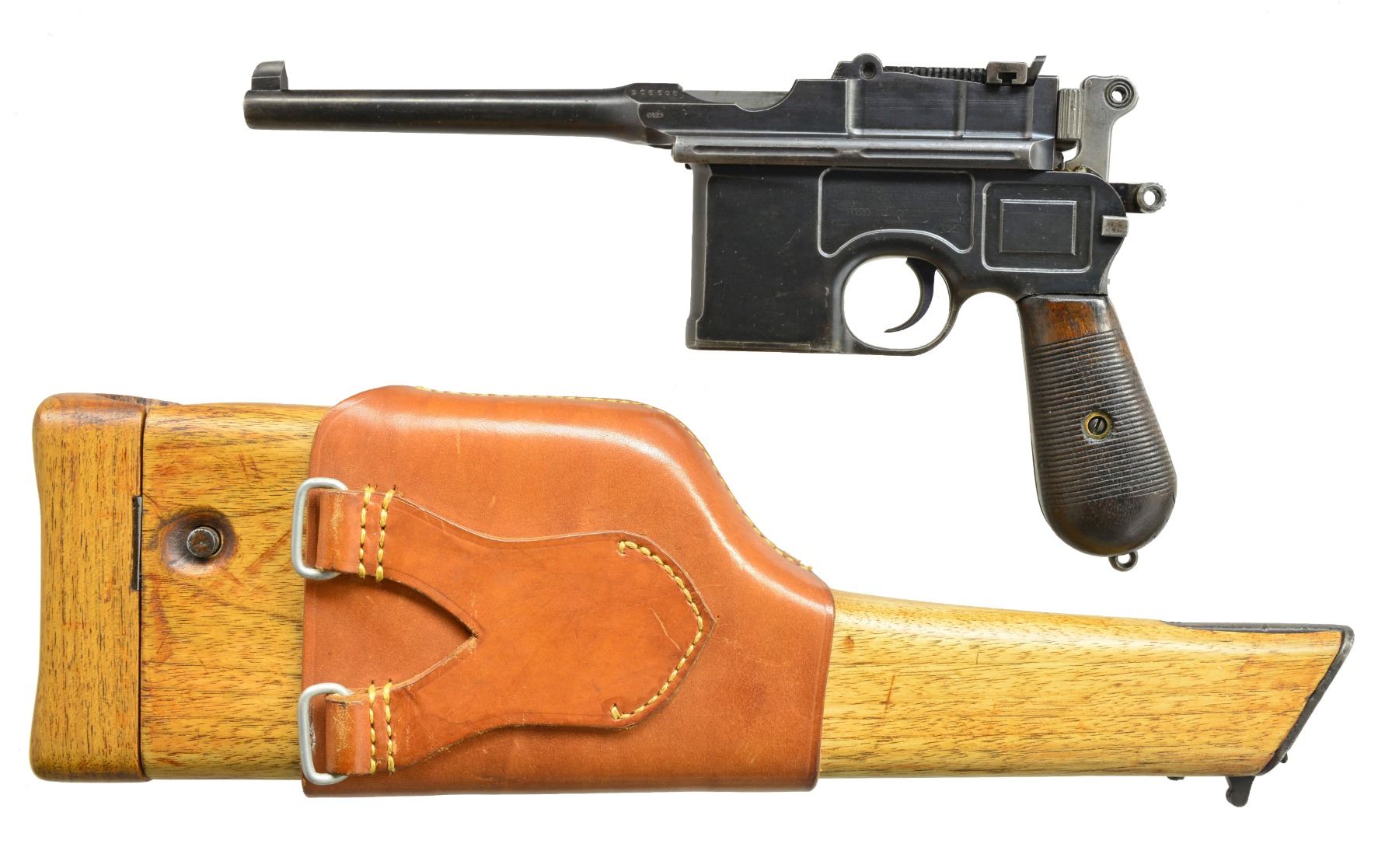 PISTOL. Cal. 7.63mm (30 Mauser). S# 206685. Bbl. 5 1/2". Standard prewar commercial variation w /31 groove matching # walnut grips. Matching numbers on externally visible parts plus floorplate. Mauser legend on right side of frame & over chamber. Crown U proofs, sm. ring hammer, 50-1000 sight & lightening cuts on receiver rails. Appropriate fire blued components. UNATTACHED ACCESSORIES: wood stock / holster w/ good fitting attachment iron; not numbered. Very good appearance as refinished including vintage brown leather holder. CONDITION: very good appearance as refinished w/ prior pitting showing in thumb print sized area above right grip plus sides of frame under grips. Rub marks & slight oxidation (near front) on floorplate. Very clear markings & nice traces of fire blue, especially on extractor. Good bore w/ slight wear & appearance of cleaned light pitting. Proper mechanical functioning & appropriate spring action. Missing lanyard ring. (21-1713/NW). CURIO. $1,000-1,500.