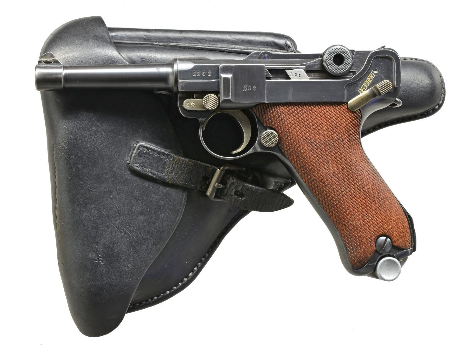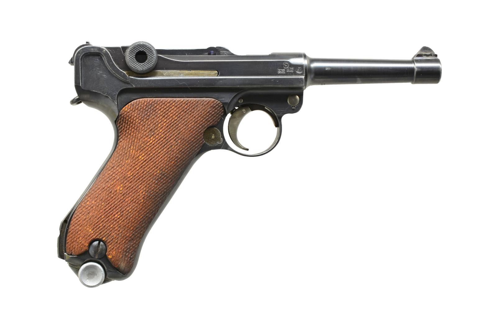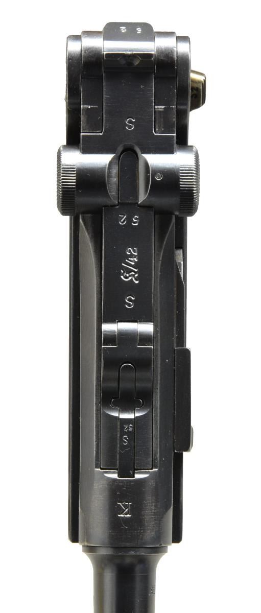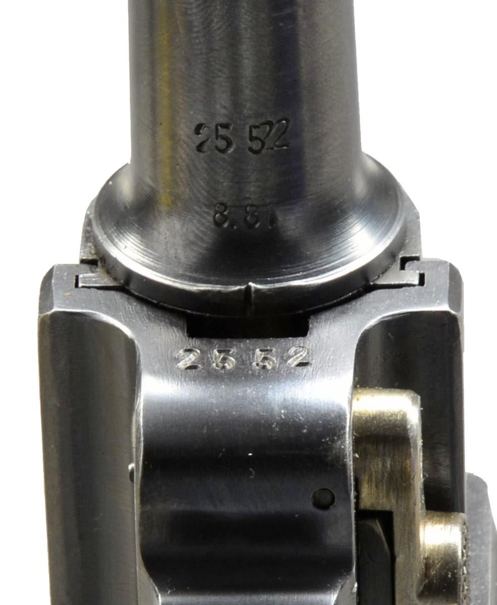 Cal. 9mm Luger. S# 2552. Bbl. 4" w/ I beam 37 proof & odd S#3 stamping; 2 & 5 are close followed by space then close 522. There is no "S" on the bbl. but there is on fin shaped front sight blade. Mfg. 1934 w/ secret date code of "K" used as Hitler violated Treaty of Versailles by secretly building military forces. First variation w/ I beam 37 proofs & w/in 2nd S# block of 1700-5250 correctly having mixed script & gothic “S” marks on all components except previously described bbl. Matching numbered parts including rear toggle pivot. Strawed sm. parts & appropriate internal areas in the white; checkered walnut grips matching numbered & proofed (unmarked grip screws). MAGS: 2 correct very good to near excellent 8 rd. tin plated bodies w/ I beam 37 proofs at base of spine & on aluminum bases. Both matching numbered “2552” w/ 1 additionally having “+”. UNATTACHED ACCESSORIES: good plus black flap holster w/ buckle & strap retention. Top of each belt loop repaired; one restitched, other retained by fine wire. Repaired flap hinge stitching. Back between loops marked “GEBRUDER KLINGE” over “DRESDEN” over “1936” over “WaA132(?)”. CONDITION: very good to excellent appearance w/ very minimal holster like wear on side plate, front edges of receiver & at muzzle. Fit of receiver to frame noticeably snug. 2 Sm. areas of raised metal around right side of receiver at rear toggle pivot. Most markings appear sharp & deep. Exceptional straw colors w/ very minimal fading on trigger. Very good left grip w/ light to moderate hand wear. Right grip w/ more hand wear & occasional light spots. Refinished grip screws w/ somewhat lg. slots. Very good bore. (20-3345/NW). CURIO. $4,000-6,000.