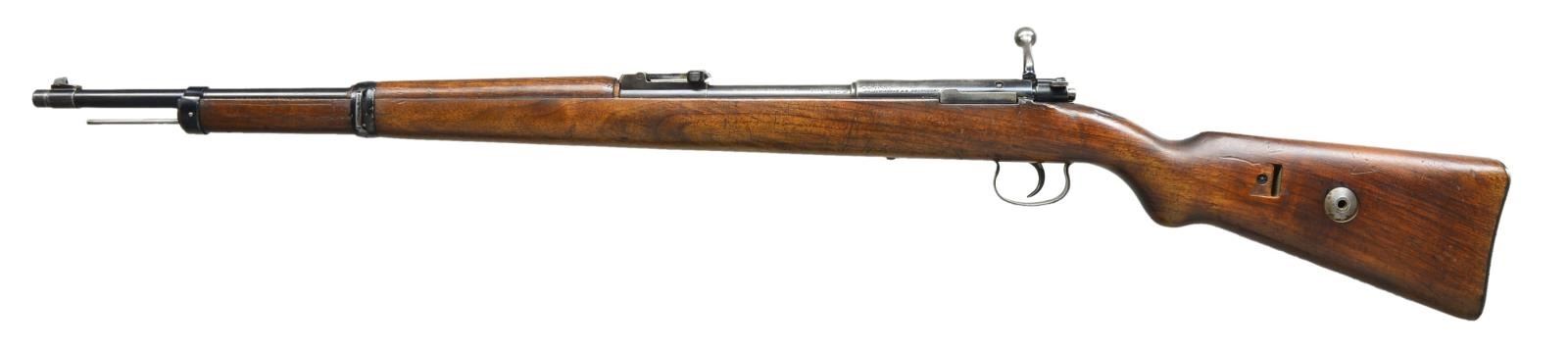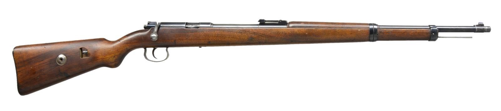 Cal. 22 LR. S# 14613. Bbl. 26" rnd., fitted w/ military style tangent rear sight & inverted V front through short ramp. Left rear marked w/ cal., S# & proofs. Model 1934 improved Mauser single shot action is ungrooved & has Mauser banner on top. Left side marked "MAUSERWERKE" & address. Right side marked "DUETCHES SPORT-MODELL" Bolt w/ pear shaped knob has flag safety. Military style walnut uncheckered stock w/ sling cut has, takedown disks, steel buttplate, & banded on handguard. CONDITION: metal parts retaining about 60% original blue. Stock w/ old, possibly original finish has a lg. number of minor marks & dings. Handguard looks to be a replacement. Fine shiny bore. Mechanically good. Front action screw possible replacement & does not fit flush. These are fairly scarce when made by Mauser. They retailed for $39 in 1939. (21-2548/MGM). CURIO. $500-900.