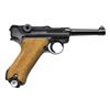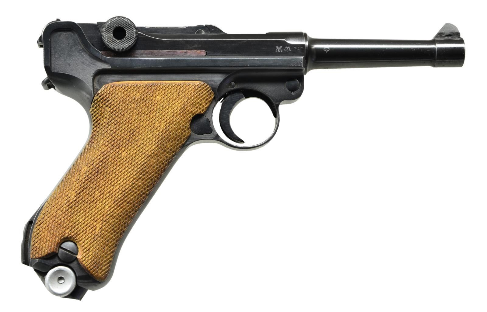 Cal. 9mm Luger. S# 6195s. Bbl. 4" matching numbered having serrated fin shaped front sight & proofs of eagle party symbol & eagle 655. Matching numbered fully checkered grips w/ eagle 655 proofs plus "E" on left. Matching numbers on takedown lever, trigger, sideplate, safety lever, safety bar, hold open latch, receiver, sear & all component of toggle assembly to include rear pivot. 41 over chamber, eagle party symbol on breech block plus eagle party symbol & 2 eagle 655's on receiver. Approx. 126,000 mfg. S# 3300n-1000; identical to Black Widow model except wood grips instead of black plastic. All blued including interior, no strawed parts, plum toned ejector, stock lug & left side frame marked "P.08". MAGS: 1 Correct matching numbered 8 rd. w/ 2 eagle 37 proofs, "fxo", "P.08" & aluminum base numbered 6195s plus "1" indicating primary mag. CONDITION: very good to excellent appearance w/ high quality refinish having slightly glossier polish to include face of muzzle. All marks & proofs are distinct. Very good to excellent grips w/ extremely faint occasional marks. Good to very good bore having distinct rifling & frosting to light pitting. (22-6418/NW). CURIO. $1,200-1,800.