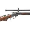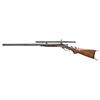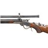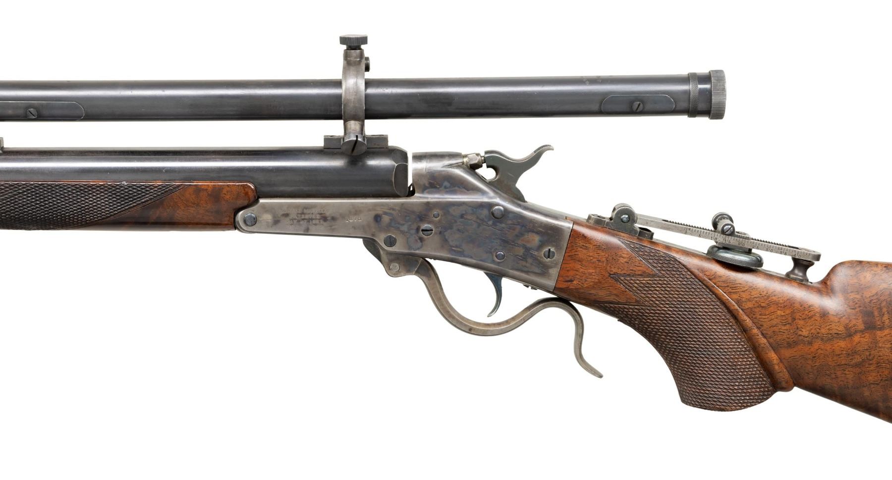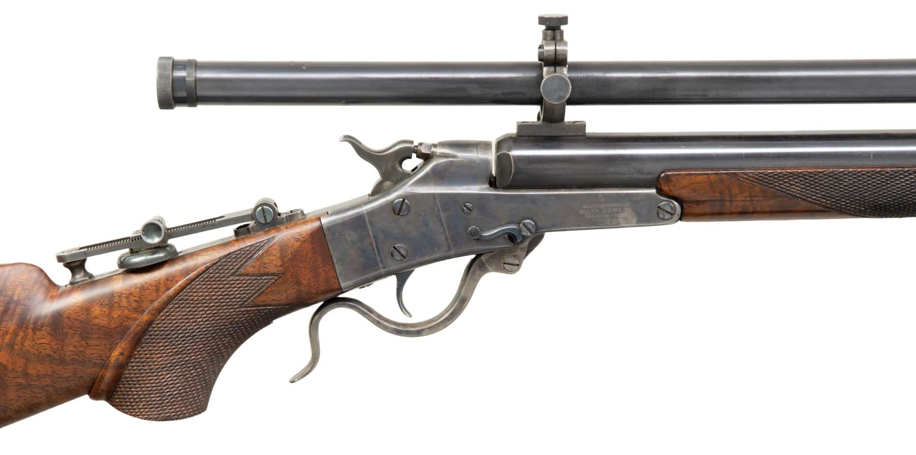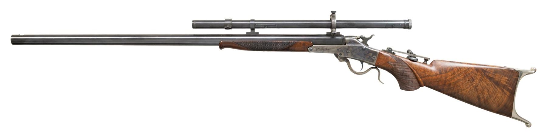Cal 25-20 Single Shot. S# 13035. Bbl 28" round with gap at the breech. Breech end of bbl is relined and rechambered for the 25-20 SS cartridge. Right side of action has three line Mass Arms marking over Model 1882. Left side of receiver has Edward Maynard patent marking followed by 1873 Model marking. Left side of bbl lug has handstamped "25-20 SS" marking. Malcolm 18 1/4" target scope with external adjustments and standard crosshairs mounted on bbl blocks. Muzzle end of bbl has open sight dovetail. Top tang is fitted with a vernier sight having a large disk aperture. Blue finished bbl with case colored action. Schnable tipped forearm and pistol grip stock of fancy walnut with hand checkering. LOP: 13 1/4" to a nickel finished Schutzen buttplate. CONDITION: over 90% bbl blue showing slight edge wear. Action retains 70% lightly faded case colors. Forearm apparently has original gloss finish showing scratches and marks. Refinished stock has a good satin finish. Sound mechanics. Bore is bright with moderately worn rifling. Scope has clear optics. (01-28668/DS). ANTIQUE. $2,000-3,000.