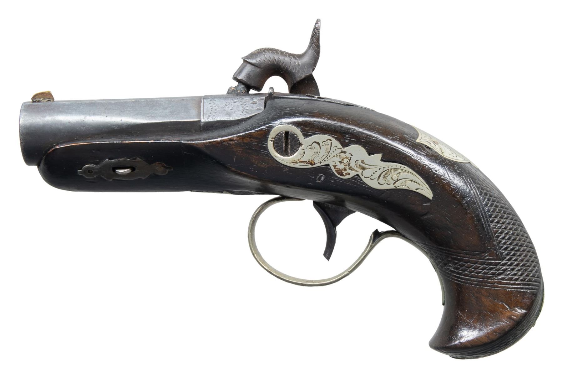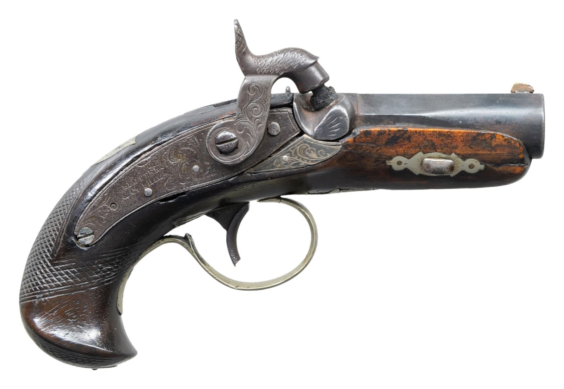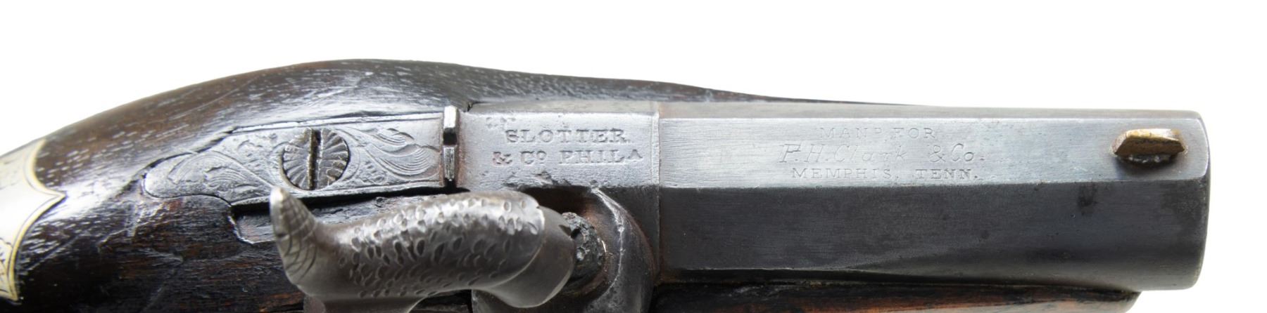 Cal. 45. NSN. 5.5"overall, 1 7/8" barrel marked by retailer "MADE FOR / FH CLARK & Co. / MEMPHIS TENN", "Slotter & Co. Phila" maker mark on both lock and breech. CONDITION: very good overall, barrel retains much of a re-blued finish, balance of metal, iron patina with pitting, stock is sound and solid, large inset to right top of forestock. PROVENANCE: The Esteemed Norm Greenberg Collection. (01-27611/JS). ANTIQUE. $1,500-2,500.
