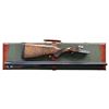 AND CASE. Cal. 12 Ga. 3". S# 383879. This well made model retails for over $7,000. This gun has 30" shoe lump barrels with model and gauge marked on slightly raised matted rib. Barrels are marked with steel type, importer and maker's name and address. Barrel flats are stamped with 2001 German nitro proofs for 3" chambers. Coin finished ogee backed boxlock action features non-automatic safety, cross bolt third fastener, bushed strikers, side clips, pin cocking indicators on sides and single selective trigger. Action is engraved with some geometric borders and scrolls with game scenes on sides. Feeding quail on left and flying quail on right. Left quail scene has engraver's signature "GL". Blued top lever has silver inlay "EL". Trigger guard has scroll engraving on bow. Capped pistol grip buttstock made of well marbled and lightly figured European walnut measures 15-1/4" over black Kick-ezz pad. Point pattern checkering is at grip. Matching splinter ejector forend has Deeley release. MEASUREMENTS: BBLS: Bore Diameter: L .729. R .729. Restriction: L (screw chokes). R (screw chokes). Wall thickness: L .033. R .034. STOCK: DAH: 2-5/8. DAC: 1-1/2". CAST: about 1/4" off. LOP: 15-1/4". WEIGHT: 7 lb. 1 oz. UNATTACHED ACCESSORIES: gun is accompanied by its original green vinyl case with leather corners, lined in green cloth by Emmebi. A leather Merkel label is in lid. Case contains: 2 Briley extended choke tubes, removal tool and two keys. Also included is a plastic box containing 8 matching choke tubes (for a total of 10). CONDITION: very fine retaining nearly all original factory finishes on wood and metal. Buttstock shows a considerable number of fairly heavy marks. Bores are bright and shiny. Mechanically fine. Case is very fine, with some marks. Interior is good. (25-551/MGM). MODERN. $3,700-5,500.