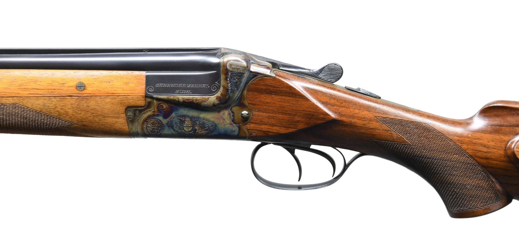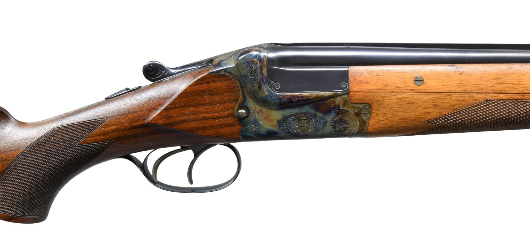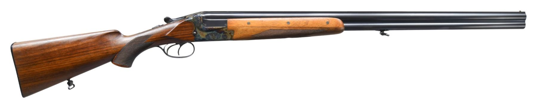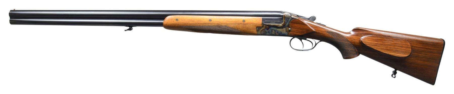 Cal. 16 GA, 2 3/4". S# 42075. Bbl. 28" with solid rib and brass front bead. Scalloped frame boxlock action with case colored finish having light scroll engraving. Features include selective ejectors, pin type cocking indicators, and double triggers (front trigger is hinged). 3-piece walnut forearm and flat knob pistol grip cheekpiece stock. LOP: 14 1/8" over original checkered buttplate. DAC: 1 3/8". DAH: 2 1/2". Stock has a neutral cast. Toeline of stock and bottom bbl. are fitted with sling swivels. Bore Diameter: O: .664, U: .665. Choke Constriction: O: .030 (Full), U: .030 (Full). Minimum Wall Thickness: O: .036, U: .034. Weight: 6lbs. 6.3oz. Importation was discontinued in 1984. CONDITION: near excellent, retaining 98% blue and case colored metal finish. Original stock finish shows a few light handling marks. Action is tight and on face with top lever sitting slightly right of center. Bright near excellent bores. (25-5131/DS). MODERN. $2,500-3,500.