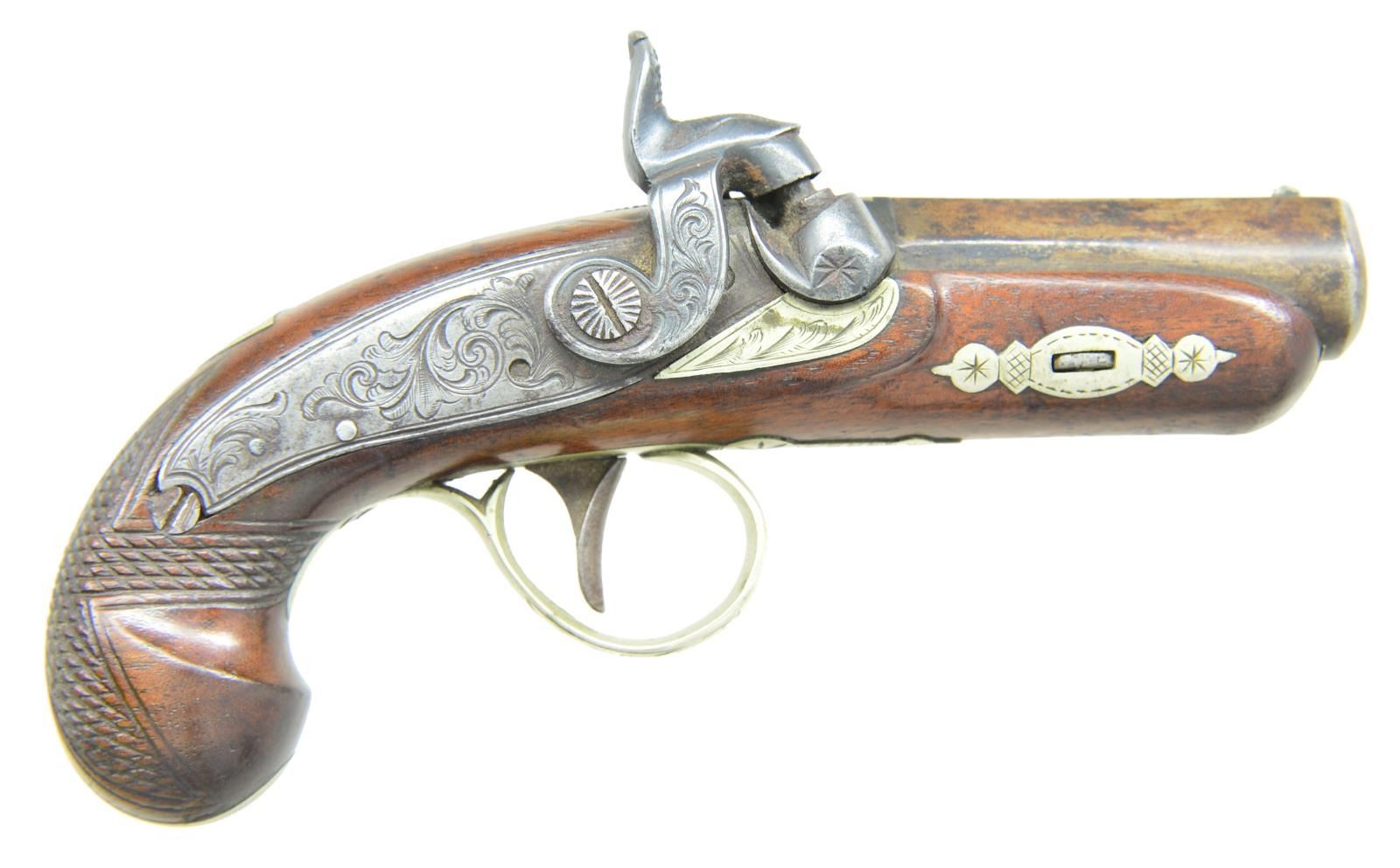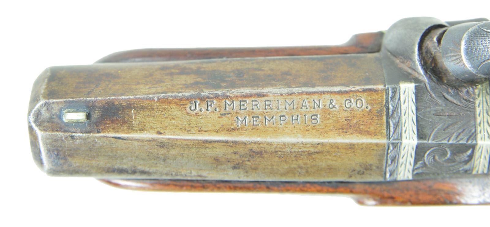 Cal. 40. NSN. 5.5” overall, 2” barrel marked “J. F. MERRIMAN / MEMPHIS”. James E. Merriman was jeweler & luxury goods dealer in prewar Memphis. Known original agent marked pistols are engraved and correctly spelled, this mark is unknown. CONDITION: very good overall, action functions but sloppy, dirty rifled bore. (01-21873/JS). ANTIQUE. $1200-1800.