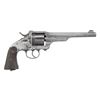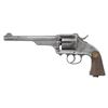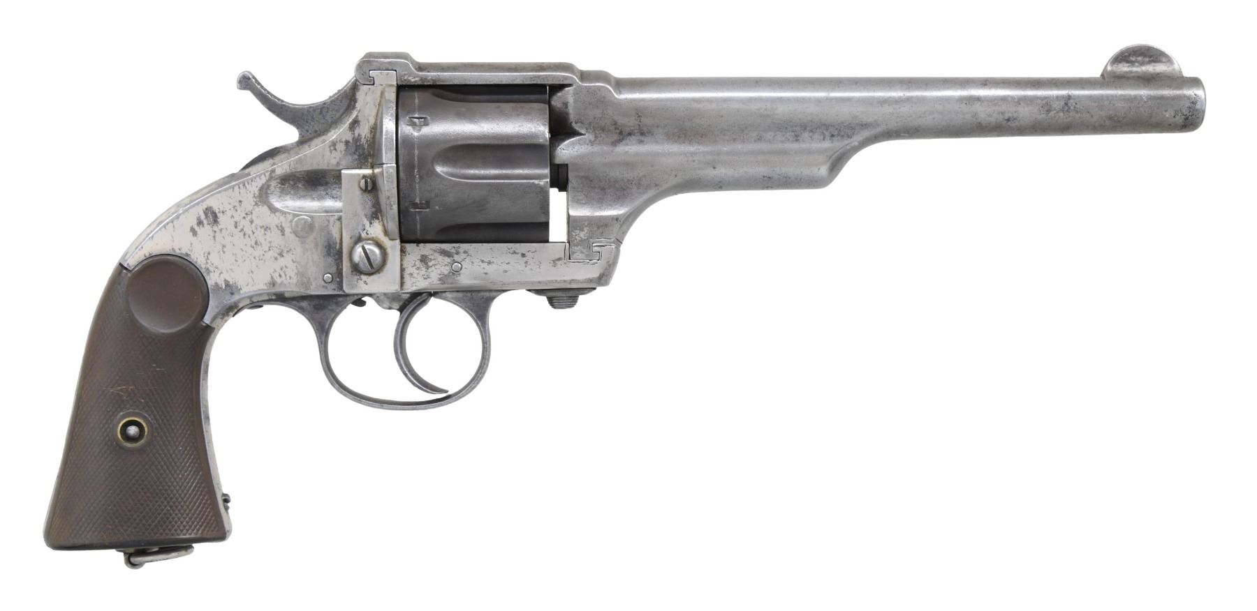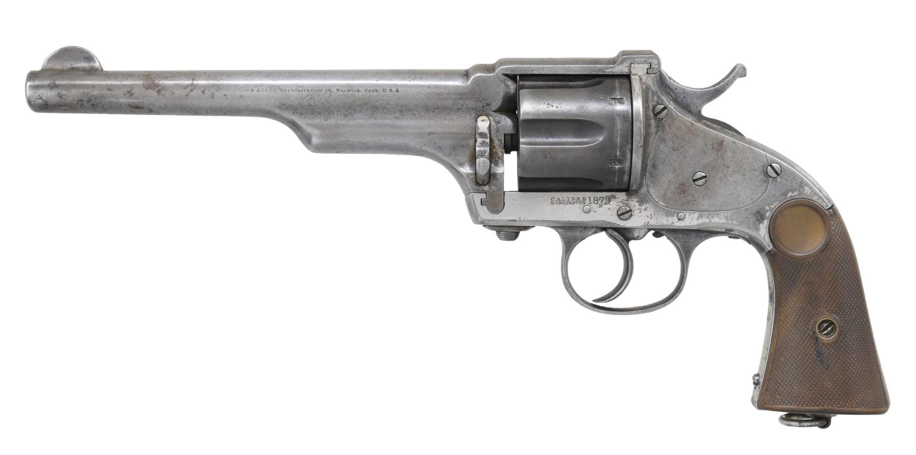 FRONTIER MODEL DOUBLE ACTION REVOLVER. Cal. 44-40. S# 19258. Bbl. 7". Large Frame Frontier Model double action revolver mfg. at the Hopkins & Allen Manufacturing Company in Norwich, Ct. Left side of the bbl. is marked "HOPKINS & ALLEN Manufacturing Co. Norwich, Conn. U.S.A." ("HOPKINS" is mostly illegible), with "MERWIN & HULBERT & Co. New York, U.S.A. Pat.Apr.17.77.June 15.80.Mar.14.82.Jan.9.83." marked across the top. Left side of the frame is marked "CALIBRE/ WINCHESTER", followed by "1873" (.44-40 W.C.F.). Metal components exhibit a nickel plated finish. Frame is mounted with 2-piece checkered brown hard rubber grips. Half-moon blade front sight, with V-notch rear sight. Butt is mounted with a lanyard loop. Matching assembly #s are present on the frame, slide, and bbl. CONDITION: metal components retain fair amounts of their original nickel plated finish, exhibiting wear, flaking, and scattered losses that show through to a gray patina. Fair bore, exhibiting areas of dark pitting and strong rifling throughout. Grips show age related discoloration, smoothing, and some scattered marks from handling and storage, but otherwise remain sturdy and serviceable. (01-26226/MLW). ANTIQUE. $300-500.