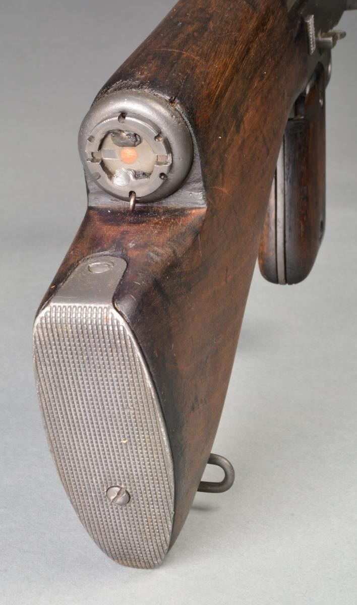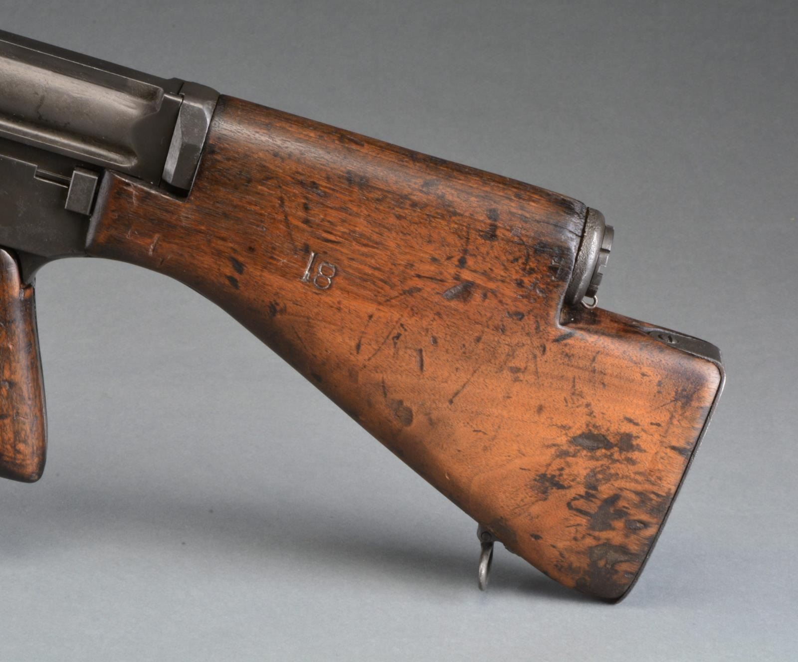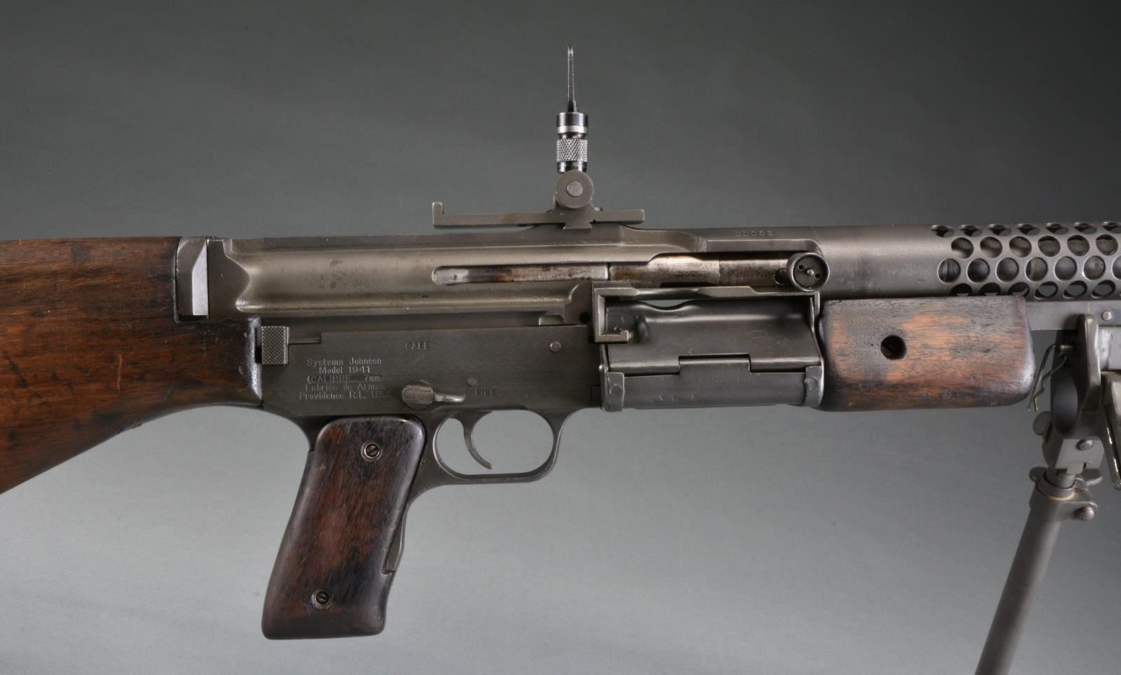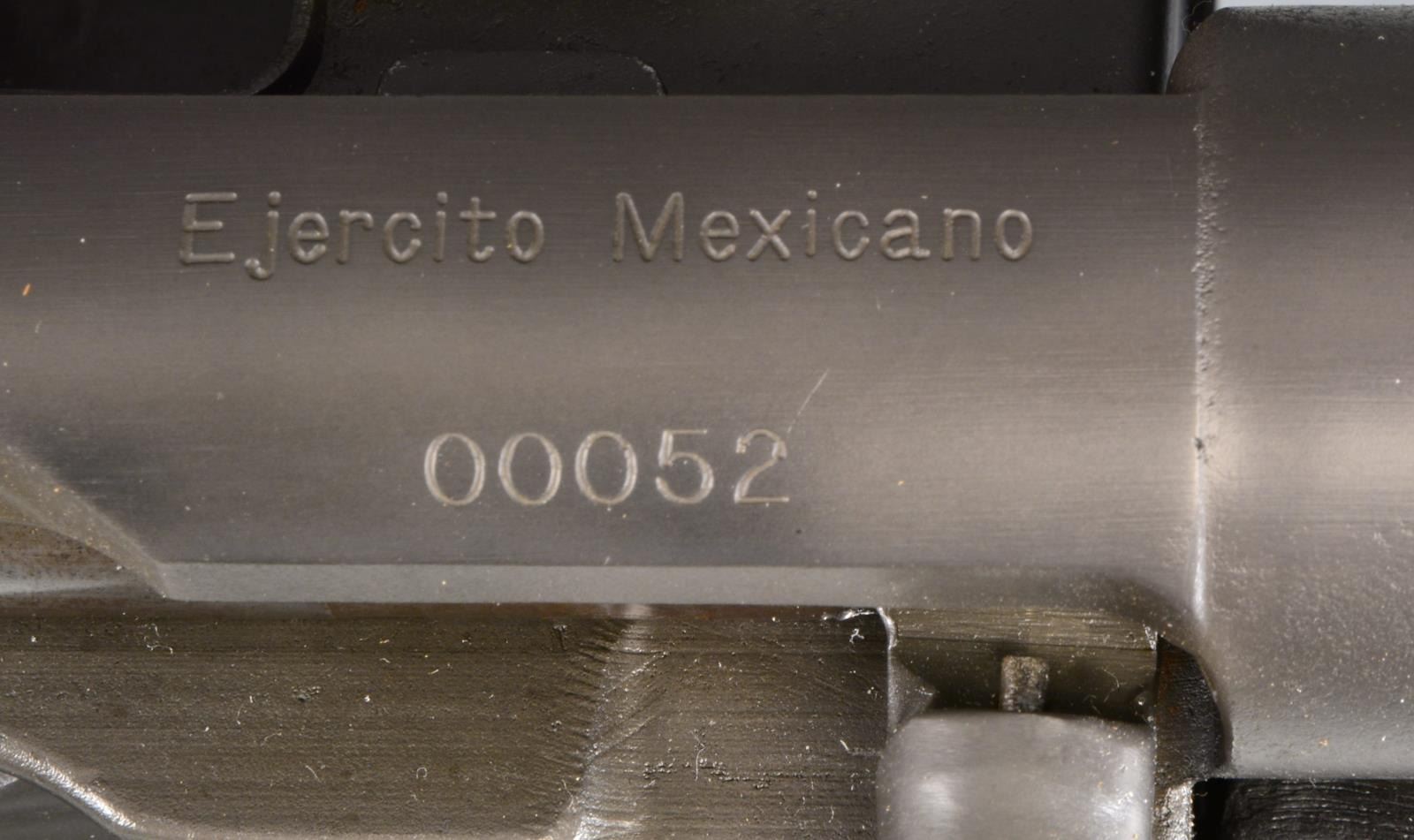 CONFIGURATION. Cal. 7x57mm. S# 00052. Bbl. 22”. An extremely interesting & unusual Johnson semiautomatic rifle. Significant prior research has been interesting in determining the pedigree of this gun. According to the records of a previous owner, sold in estate, over a decade ago, it was believed to be an experimental model; a cross between the standard Model 1941 Semiautomatic rifle & the Model 1941 light machine gun. Some of the other rare Johnson models included in that specific estate auction were once housed in the Winchester Museum & it is possible that this was yet another example although we have not come into possession of any specific documentation to confirm it. It is also possible that it was a non factory assembled rifle built from a modified JSAR receiver w/ an LMG lower, as a few others that have been spotted around the country. Marked “Ejercito Mexicano / 00052” on the top of the receiver & “Systema Johnson / Model 1941 Calibre 7mm / Fabrica de Armas / Provenance R.I., USA” on the right side of the receiver above the pistol grip. Triangle “CRANSTON ARMS CO” below Dutch acceptance mark on upper receiver between bolt & stock on right side. There is a circular perforated bbl. shroud similar to the Model 1941 LMG. The bbl. & sight system appear to be correct for the LMG family. The markings on the bbl. portion that intersect w/ perforated bbl. shroud reads “30-36” in the 12 o’clock position above the bbl. & “41” at the 6 o’clock position below the bbl. Folding, extendable bipod below bbl. in front of fore arm. There is a dust cover on the right side of the receiver, directly opposite the mag.-well, for charging the mag. w/o removing it from the firearm. Wood forearm, pistol grip & shoulder stock. The shoulder stock has a metal buttplate & is also very similar to the model 1941 LMG. Sling swivel on front under forward section of bbl. shroud & rear sling swivel at toe portion of rear stock. MAGS: 1-25 rd. steel. CONDITION: the metal has retained the vast majority of the original parkerized finish, good bore w/ strong rifling, the wood is typical of issued military firearms that while it appears to retain its structural integrity it is stained & dented from armory storage & transport; rear stock on left side includes the number “18” stamped approx. 1/2x1/2”, fire control mechanism appears to function correctly when cycled by hand. (20-884/JZ). MODERN. $8,000-12,000.