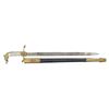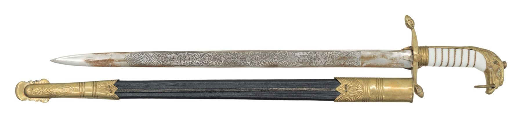 Overall: 23". The 18" blade has 12" section of engraving that has Mexican patriotic themes. Brass guard has acorn tips & Mexican academy medallion. Wire & white composite grip. Brass eagle's head pommel with loop. Black leather sheath has brass tip & throat with stud having academy emblem. CONDITION: brass has pleasing mild mustard patina. Leather intact in very good condition; blade shows patina & spots of oxidation. (02-25834/MD). $500-750.