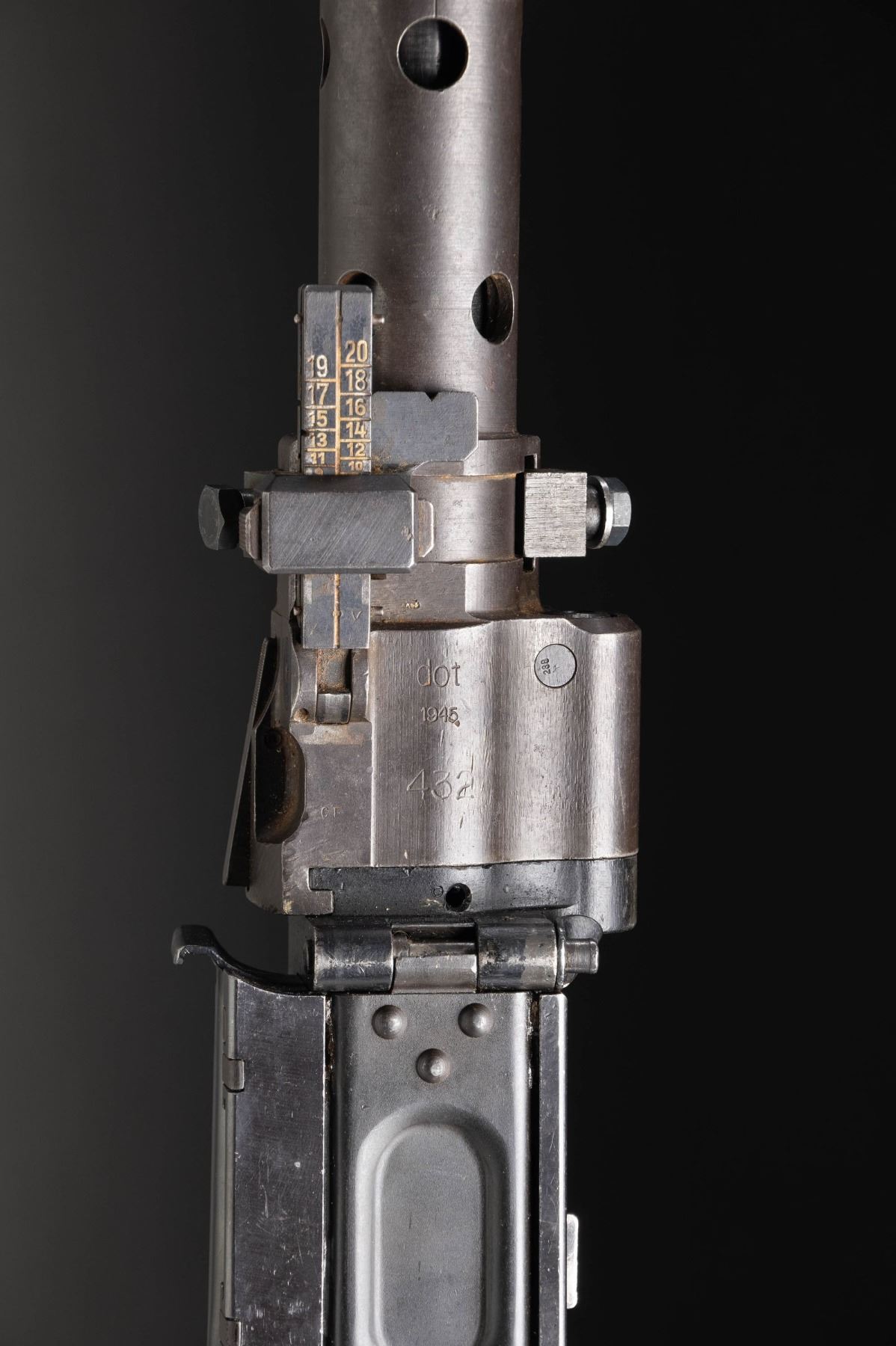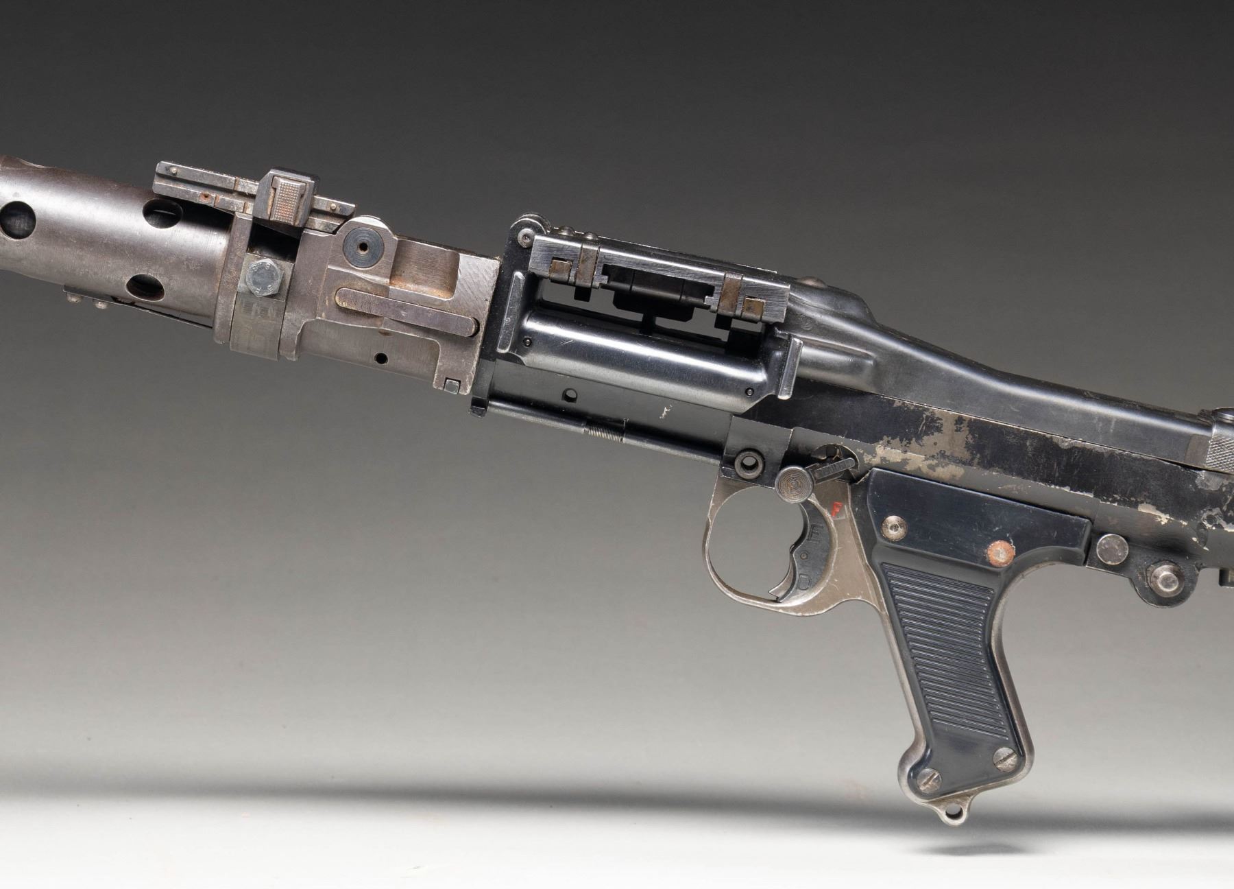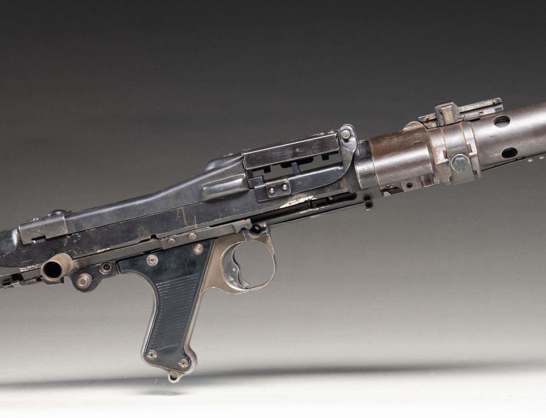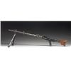 MG-34 GPMG (General Purpose Machine Gun) display gun / parts kit assembled on an original receiver, which had been cut, rewelded, and filled with steel. Top of the perforated bbl. shroud is marked with Waffenwerke Brunn's "dot" mfg. code above "1945" and the S#, with most remaining parts appearing to have been of post-war issue or mfg. Receiver exhibits a black enamel type finish, with remaining metal components exhibiting a blue finish overall. Trigger housing exhibits a phosphate finish. Plain wood buttstock with 2-piece grooved black synthetic grips. Standard flip-up iron sight. Complete with original German WWII bipod. Bbl. shroud is frozen, with bbl. markings and bore condition being unable to be confirmed. No matching numbers present. CONDITION: receiver retains large amounts of its black enamel finish, exhibiting scattered spots and areas of flaking. Blued parts retain large amounts of their period arsenal blue finish, exhibiting varying degrees of wear and thinning, with varying degrees of oxidation/pitting present overall. Buttstock exhibits scattered marks and impressions from handling and storage, with a crack present on the underside, as well as a circular wood plug repair present on the upper and lower section. (02-25539/MLW). NON-GUN. $1,500-2,000.