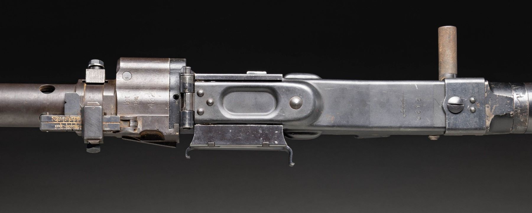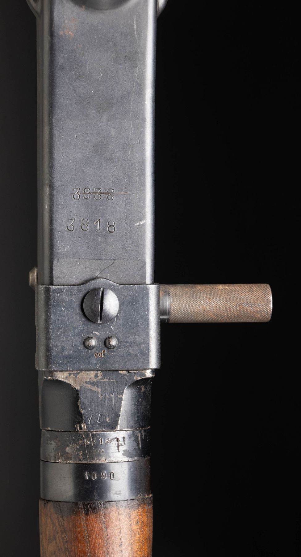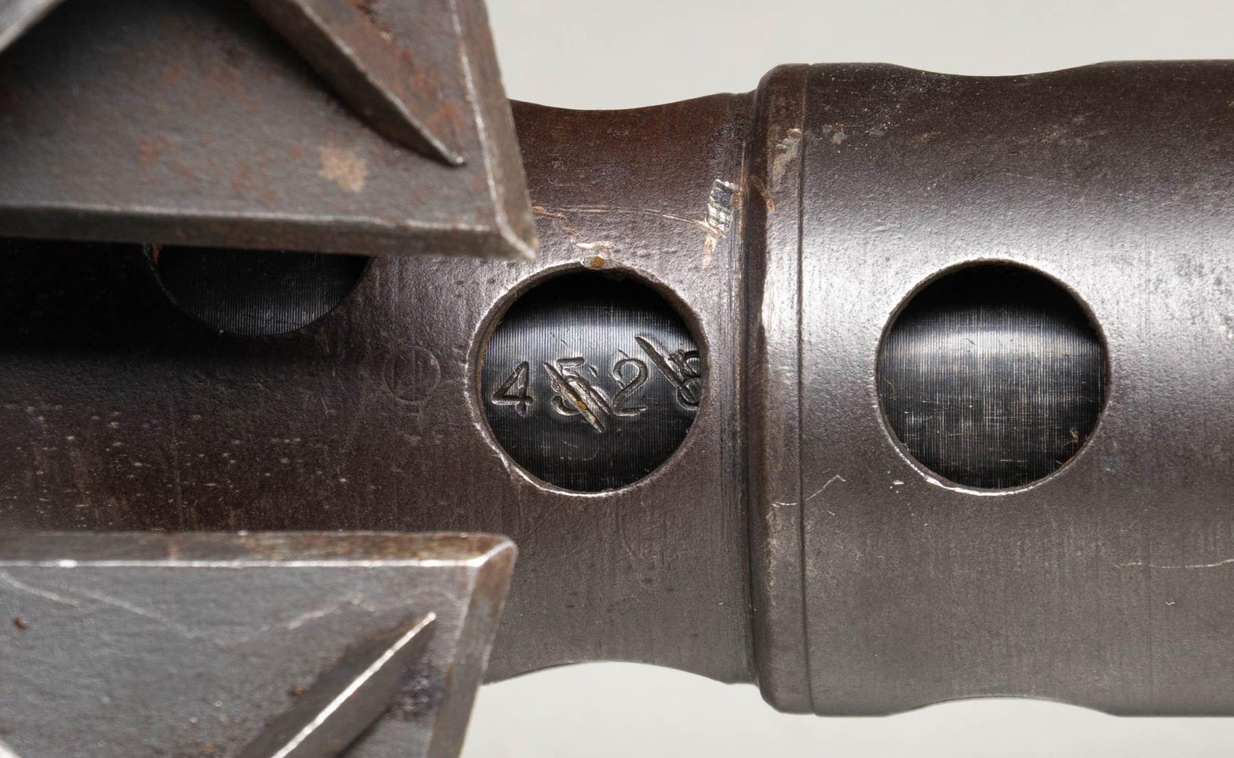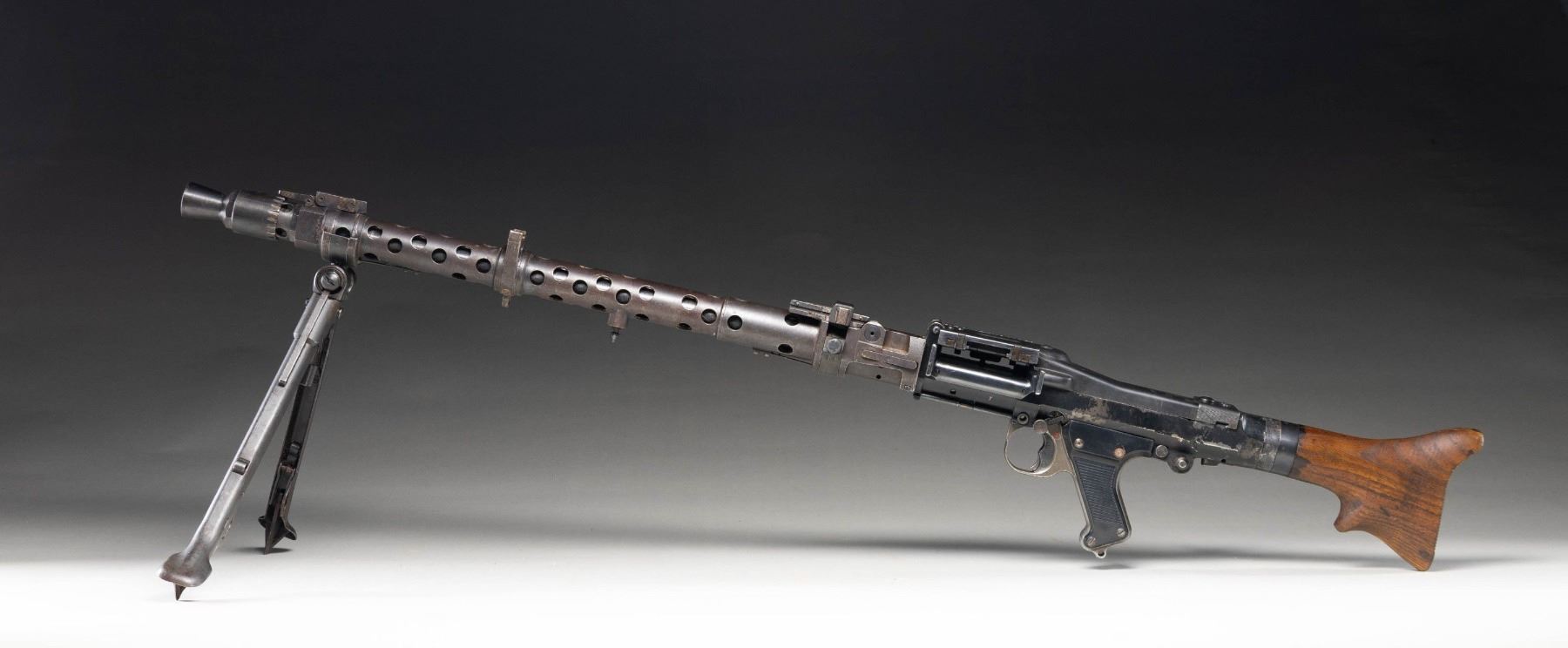 MG-34 GPMG (General Purpose Machine Gun) display gun / parts kit assembled on an original receiver, which had been cut, rewelded, and filled with steel. Top of the perforated bbl. shroud is marked with Waffenwerke Brunn's "dot" mfg. code above "1945" and the S#, with most remaining parts appearing to have been of post-war issue or mfg. Receiver exhibits a black enamel type finish, with remaining metal components exhibiting a blue finish overall. Trigger housing exhibits a phosphate finish. Plain wood buttstock with 2-piece grooved black synthetic grips. Standard flip-up iron sight. Complete with original German WWII bipod. Bbl. shroud is frozen, with bbl. markings and bore condition being unable to be confirmed. No matching numbers present. CONDITION: receiver retains large amounts of its black enamel finish, exhibiting scattered spots and areas of flaking. Blued parts retain large amounts of their period arsenal blue finish, exhibiting varying degrees of wear and thinning, with varying degrees of oxidation/pitting present overall. Buttstock exhibits scattered marks and impressions from handling and storage, with a crack present on the underside, as well as a circular wood plug repair present on the upper and lower section. (02-25539/MLW). NON-GUN. $1,500-2,000.