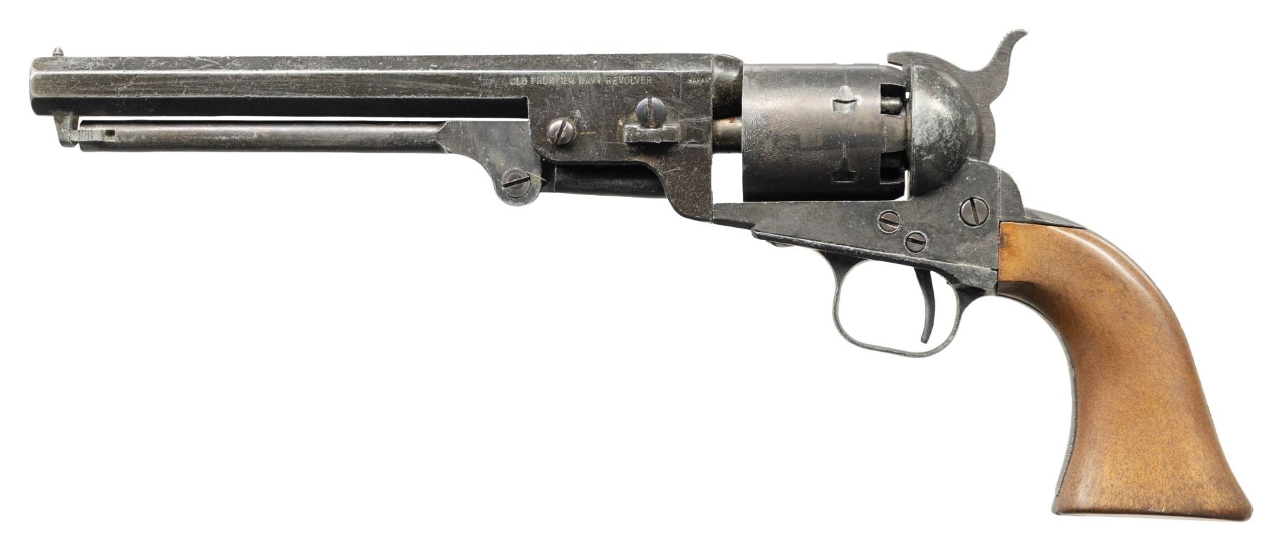 Non-firing Japanese made replica of an 1851 Navy revolver. Matte gray finish. Simulated hardwood grips. UNATTACHED ACCESSORIES: S&W 41 box & some tools. CONDITION: metal shows scattered flaking finish & handling marks. Grips show some handling marks. Hammer & cyl. function when hand cycled. (02-26576/MJC). NON-GUN. $100-150.