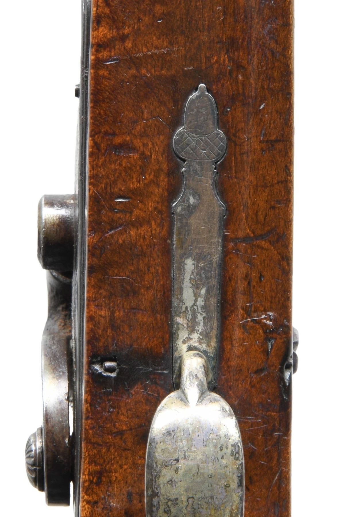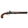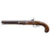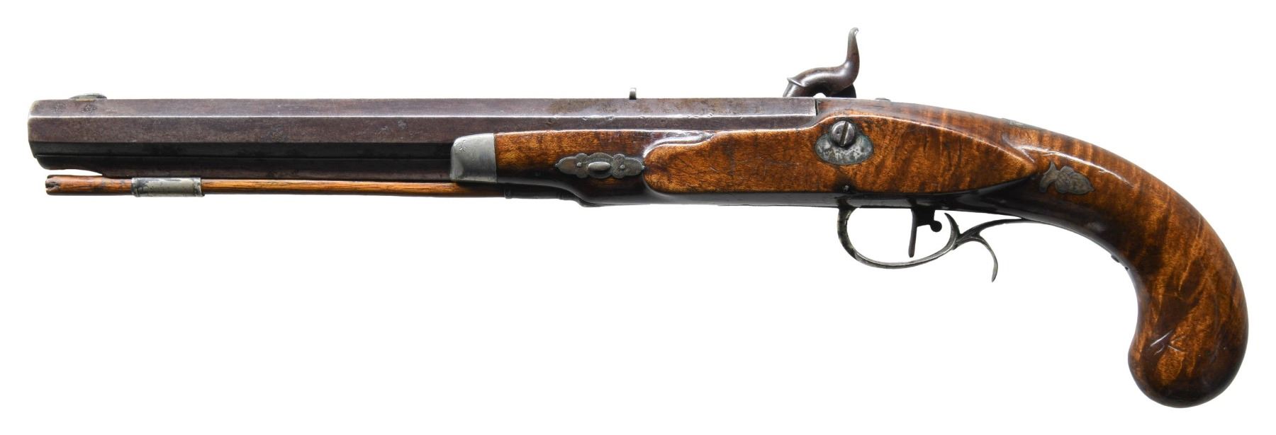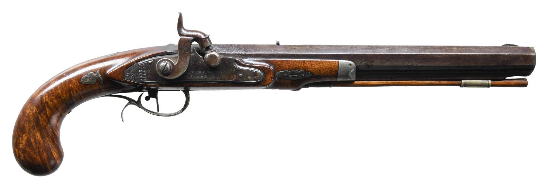 PERCUSSION PISTOL. Cal. 52. NSN. Per "American Gunsmiths" by Frank Sellers, Michael M. Maslin was a Lockmaker only in Baltimore, MD (1822-1833d) & Philadelphia, PA (1847d). Oct. 10.5" w/ bolster style conversion. Brass blade front sight & notch rear sight. Rebated, engraved Flintlock converted to percussion. Wedge fastened walnut stock ornamented with German silver acorns on sides of wrist, wedge escutcheons, & finial of triggerguard; other German silver pieces including thimble, side plate, shield wrist plate & ramrod pipe. Pewter nose cap. Hardwood ramrod. CONDITION: barrel & lock have even brown patina appearance showing spots of corrosion on sides. Silver finish peeling from parts, but has some coverage mixed with patina. Wood has even coverage of varnish with numerous dings & scratches. Dark oxidized bore with gain twist rifling. PROVENANCE: The Esteemed Norm Greenberg Collection. (01-27614/MD). ANTIQUE. $800-1,200.