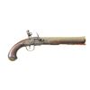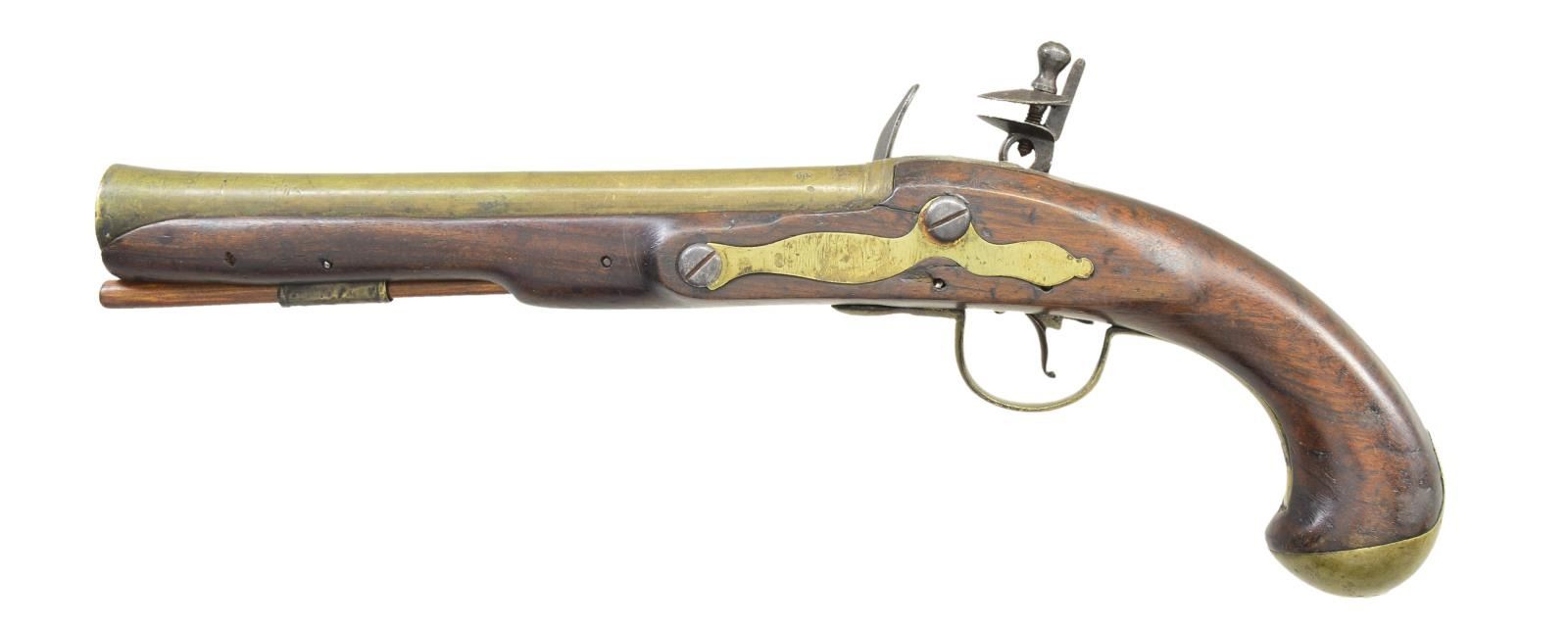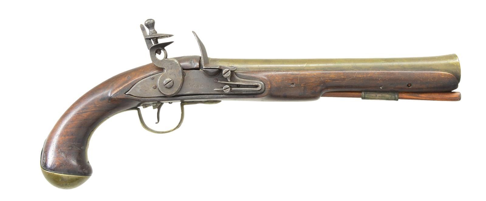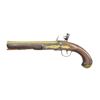 STYLE PISTOL. Cal. approx. 50. NSN. Bbl. 9" brass w/ flared blunderbuss style muzzle & smoothbore. Inside diameter at muzzle is 7/8". Breech end has London definitive black powder proof & London view mark. Flat iron lock & hammer w/ unbridled pan. Lock is marked “MEMORE” referring to Michael Memory (1714-1750). Pin fastened round butt walnut stock. Brass fittings consist of butt cap, trigger guard, side plate & single pipe. Replacement hardwood ramrod. CONDITION: bbl. has acquired an antique looking green toned patina. Brass fittings show mild patina. Lock has brown patina appearance w/ scattered light pitting. Stock shows wear & handling marks. Sound lock. Dark bore. (01-23043/DS). ANTIQUE. $1,200-1,800.