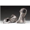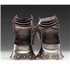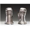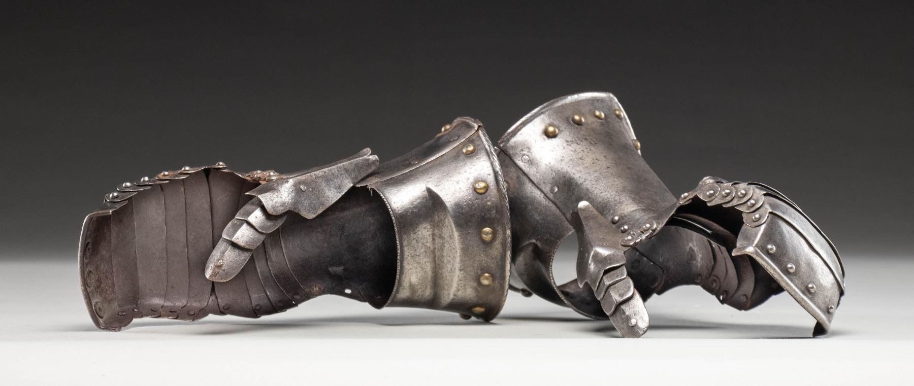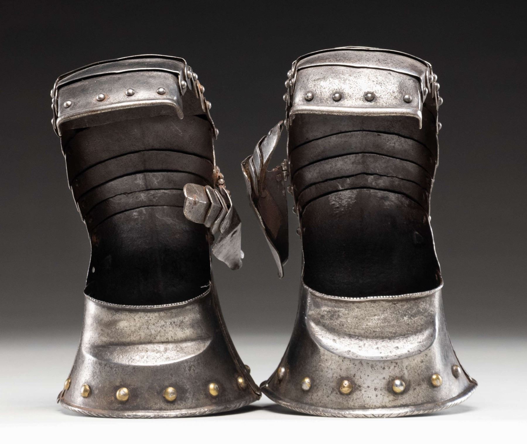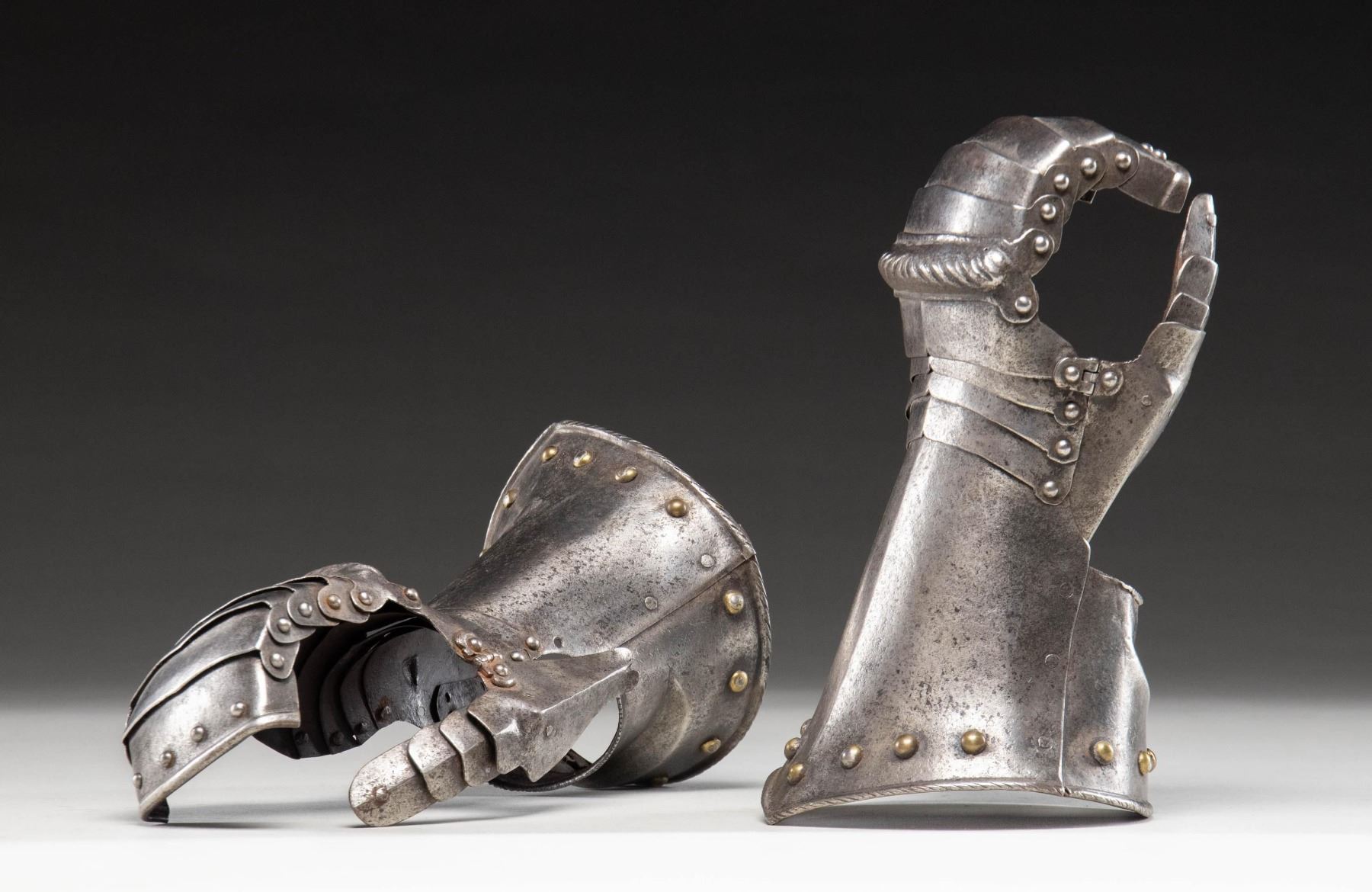 A fine matched pair of iron mitten gauntlets of German origin, possibly from Nuremberg. Each gauntlet is approx 10 1/2" in length and 5 1/4" at the peaked cuff. There are numerous brass rivets at the edge of the cuff with a gadrooned edge. There are five rivet hinged segments above the serrated knuckle bar and four rivet hinged segments below. The thumb piece is made from four plates riveted to leather and swivels on a hinge. CONDITION: iron has a lightly cleaned medium gray patina with scattered light pitting. The interior of the gauntlets have a more heavily oxidized appearance. PROVENANCE: Estate Collection of Nicholas Apergis. (02-24655/BF). NON-GUN. $1,500-2,000.
