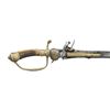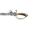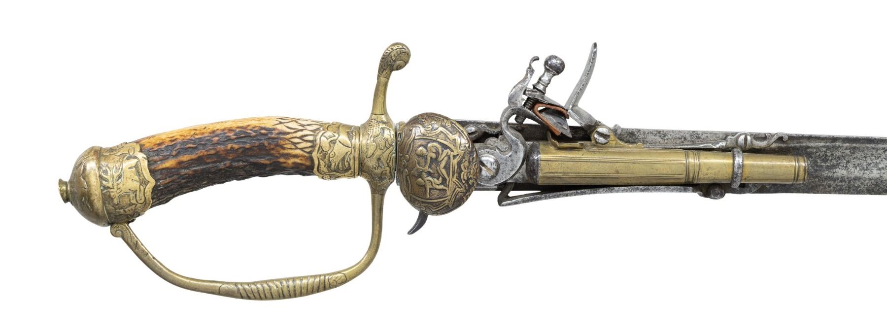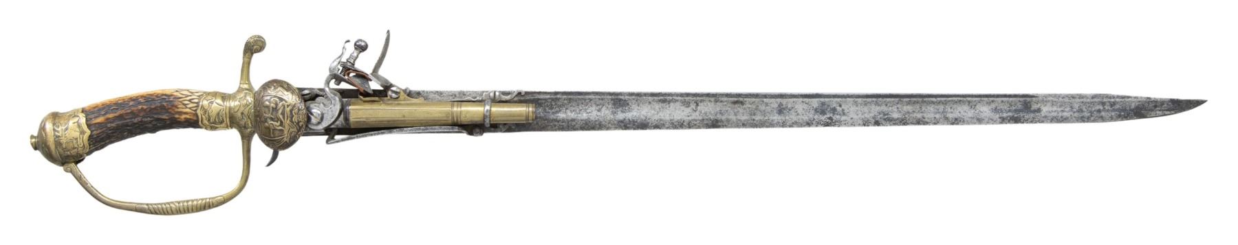 FLINTLOCK PISTOL. Cal. 28. NSN. Bbl.4 1/4".A fine impressive arm from the mid-18th century that combines a hunting sword or cuttoe with a flintlock pistol. These arms were European and often of Germanic origin. This example measures 27 3/4" overall with a 22 1/4" blade. The brass hilt has a down turned guard with an allegorical scene with a boar hunting scene on the crossguard and ferrule. The pommel also is adorned with game scenes. Antler grip. The pistol has a 4 1/4" barrel of about .28 caliber and the lock appears complete. CONDITION: the blade has a gray mottled patina with some evidence of pitting. The antler grip is undamaged. The flint mechanism operates well holding both full and half cock. PROVENANCE: Estate Collection of Nicholas Apergis. (01-27485/BF). $1500-2250.