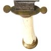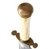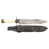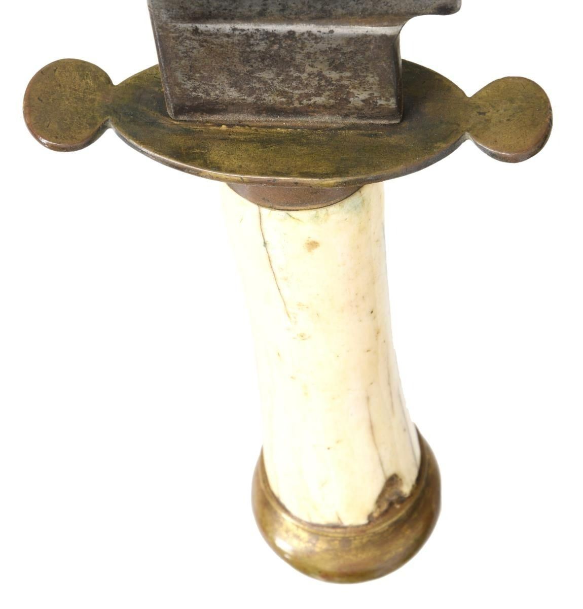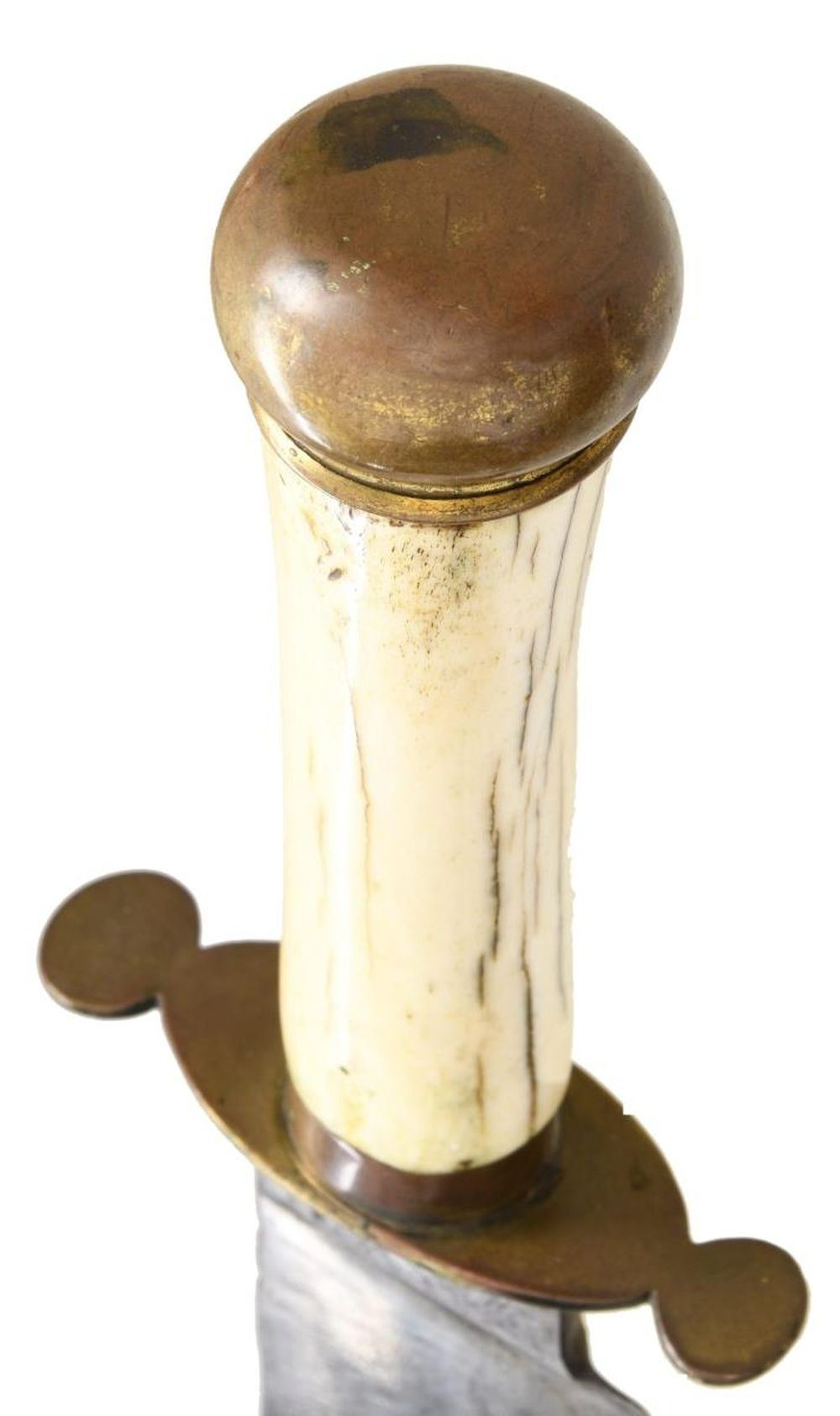 HOMEMADE SHEATH. Overall length: 17 1/2". Blade length: 11 7/8”. The plain blade has an 8” false edge at the top with notches & facets on the spine as it nears the ricasso. Brass guard with lobed finials, along with a brass ferrule & large globular pommel cap. Large, polished bone grip. Scabbard appears to be homemade of sewn bridle leather. CONDITION: blade shows evidence of cleaning & sharpening. The brass has a pleasing old patina. Grip shows numerous age cracks from drying. Scabbard is quite rough with some losses but full of character. (02-17920/BF). $600-1,000.
