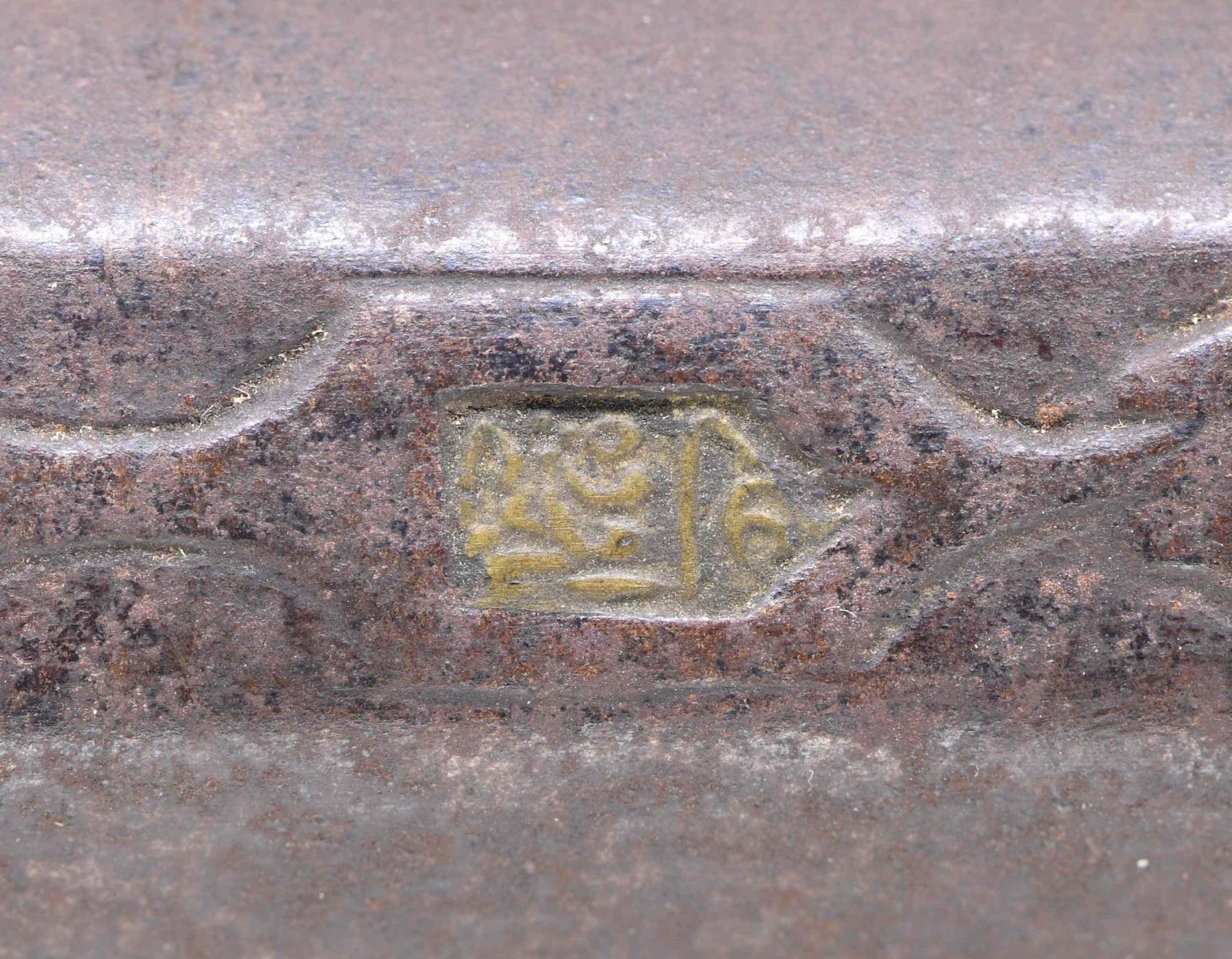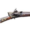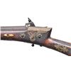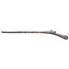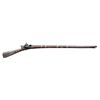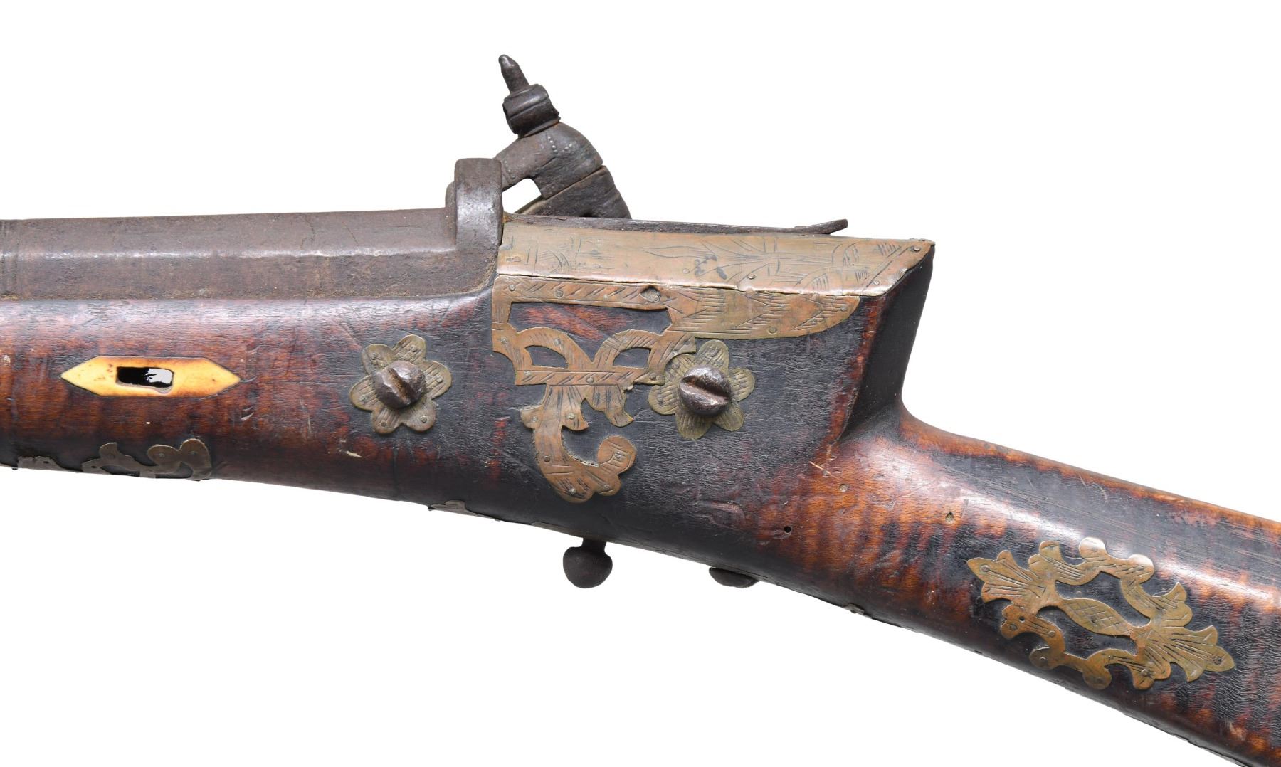 Cal. 70. NSN. Cannonade 37" barrel with brass front notch & tall rear notch sight. Top of barrel has brass insignia. Miguelet lock with ball trigger. Barrel held to hardwood stock with 4 engraved brass bands. Bone nose cap. Forearm has 4 bone inlaid wedge escutcheons. Hardwood ramrod. Pierced & segmented brass ornamentation on stock around lock & wrist. CONDITION: metal is of dark brown patina. Wood shows large cracks, worm holes, wear, and marks. Pitted dark bore. Lock appears to function when cycled by hand. (01-26195/MD). $600-900.