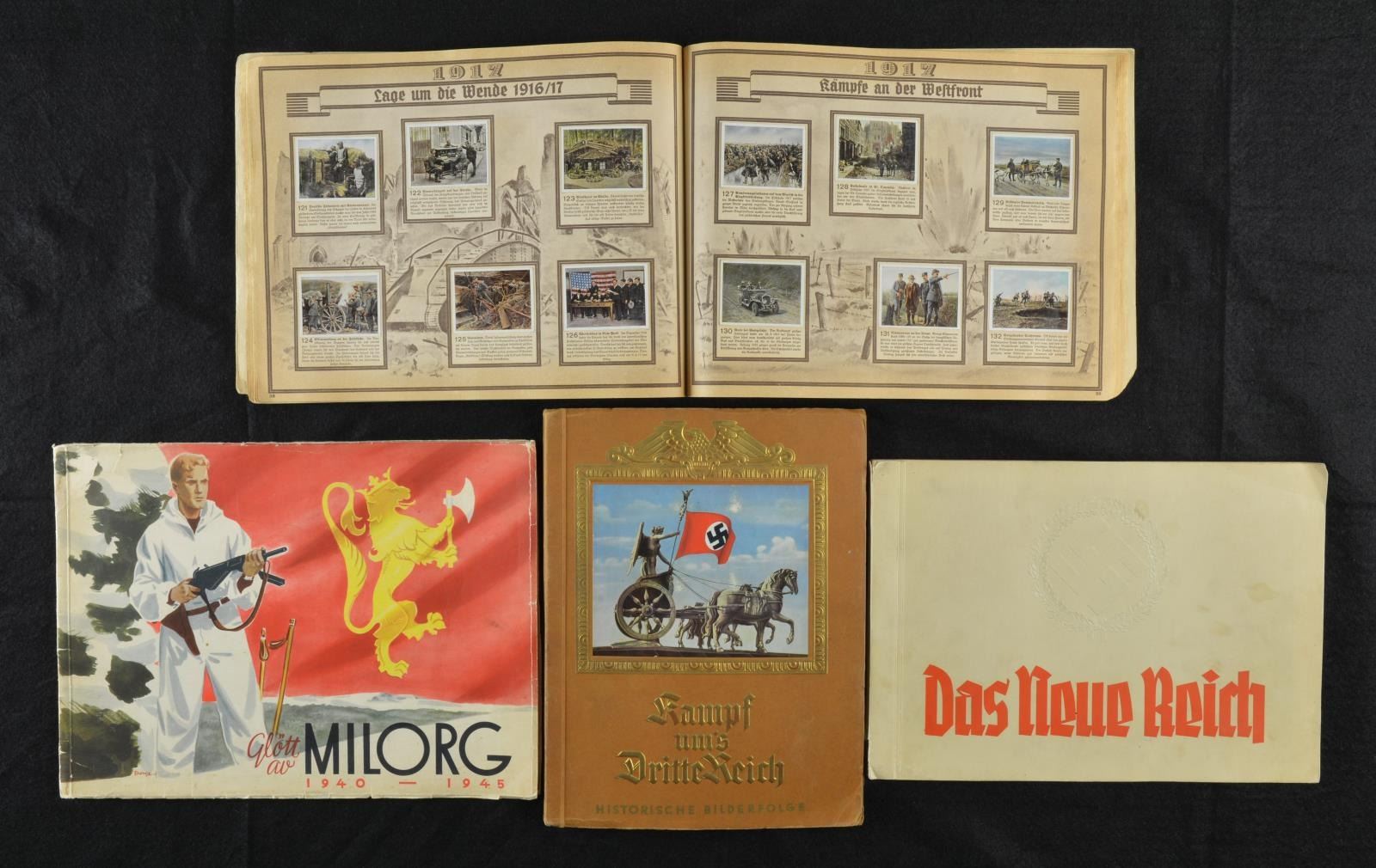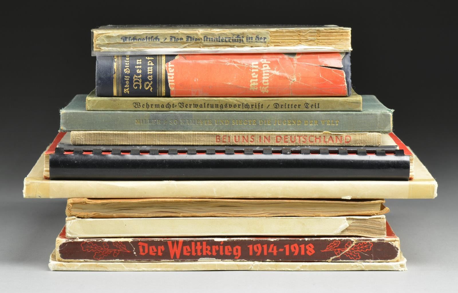 This lot consists of 12 various vintage books.8 are in German, one in English, 1 is in Norwegian, 2 in both English & Japanese. Notable among the German titles are an original Luftwaffe Handbook in worn condition, a 1936 copy of Mein Kampf w/ a worn & torn dust jacket, a 1937 dated Wehrmacht 320/3 adminstriative book, a Das Neue Reich photo book, a Kampf ums Dritte Reich (Battle for the Third Reich) & Der Welt Krieg (A German WW1 history book. The Norwegian book is Glott au Milorg 1940-1945 Glimpses of the Undergound Forces about Norwegian WW2 resistance. The English only book is He Who Laughs Last!. This book is about Norway during WW2. The first Japanese & English book is Japanese With Pictures Part 1, a WW2 US Military manual. The other Japanese & English book is the Army Language School Japanese Basic Course Volume II Lessons 7-18. The books vary in condition from poor to very good. (02-16954-9/MJC). $150-300.