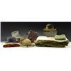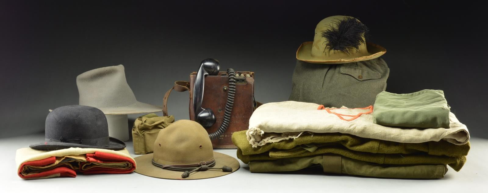 Notable items include: US Army Signal Corp Telephone EE-8-B w/ shoulder strap, lid & telephone. / Green John B Stetsons wide rim hat. / Gray Finan & Weeks wide rim hat. / Black bowler hat missing inside liner. / OD Green wide rim hat w/ outline of Artillery insignia on front & black feather. Hat is missing piece on one side. w/ holes. / OD green bandolier. / Green tie bag. / OD Green wool sleeping bag. / OG Green large service backpack. / OD Green wool pants. / Large 3 Star vanguard family flag (6 feet by 4 feet). / Burlap dress approx. 43" overall length w/ 2 front pockets. CONDITION: good overall w/ sm. insect holes, sm. tears, wear & patina. (02-16910/MD). $400-600.
