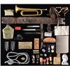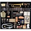 This varied lot includes 1 early 10-pocket cartridge belt with an integral bayonet frog and another cartridge pouch on the over-the-shoulder strap. The belt closes with a dual tongue and dual buckle. The over-the-shoulder strap is separated near the center. / 1 US canteen with OD green cover. / 1 Brass bugle, measuring 17", marked near the bell "US REGULATION MADE IN U.S.A." / 1 US M1902 light blue infantry aiguilette. / 1 OD canvas pouch for a first aid kit, currently holding a clip for an M1 carbine. / 1 Pair of Spanish-American War era brass spurs. / 1 WWII unissued "COVER, PROTECTIVE, INDIVIDUAL" in a foil wrapper. This was used for protection in case of gas attack. / 1 Russian AK-47 bayonet and scabbard. / 1 Pair of US Naval Ensign shoulder straps and hat band with insignia. / 1 Small red tin containing a variety of gun parts, a blank dog tag, and lapel pins. / 1 US mess kit knife with a rusted blade. / 1 Pair of WWII dog tags, dated 1943. / 1 British Italy Star with ribbon. / 2 French medals with ribbons. / 1 French WWII medal without ribbon. / 1 Belgian Cross of The National Federation of Combatants with ribbon. / 1 Japanese collar insignia with tag. / 1 Ruptured duck patch. / 1 French meal from 1915. / 1 French pin that reads "NOUS VAINCRONS". / 1 Group of oxidized WWI buttons, collar discs, and name badges. / 1 WWI Victory Medal. / 1 Korean Veterans Association Medal in box. / 1 Nationalist Chinese cap badge. / 1 WWII German HJ membership pin. / 1 Aluminum bust that appears to be Francisco Franco. / 1 Carded photograph of a German Jager officer from WWI. CONDITION: all items generally show light to moderate wear, unless noted above. Cartridge belt shows notable wear. (02-23759-2/BF). $300-500.