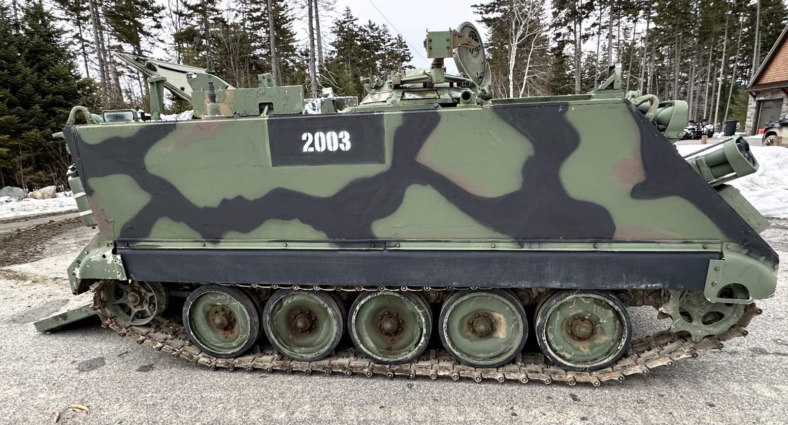 The M901 came into service in the United States in 1979, seeing significant use in both the Persian Gulf War and Iraq War. It's design is based on the M113 Armored Personal Carrier chassis and designed to carry a dual M220 TOW Missile Launcher, nicknamed "The Hammerhead" due to the aesthetics of the unique turret. Operated with a crew of 4 (squad leader, gunner, loader, driver) this 12 ton machine measures almost 16’ in length & just under 9’ wide with a height of almost 10’ w/ targeting head stowed. It has a range of 300 miles with a top speed of 38 mph. It is armored with 1.5” on the front and 1.75” on the sides. A primary asset of the M901 is its mobility. Its speed, range and power to weight ratio is equivalent to modern tracked vehicles and it is amphibious without special preparation. It can be transported with a full loadout by the C-130 Hercules, or the C-27 Spartan. Due to its upgraded suspension it can also be air-dropped, or rolled off directly into battle. The speed of the firing system, as well as its land speed, is also an asset. When it takes a firing position, it can raise up, acquire the target and engage within 20 seconds. The launcher must be lowered to reload, but can still accomplish that task, and be back to firing in only 40 seconds. It can also carry a 7.62mm GPMG, usually an M60 or M240, as defense against aircraft and personnel. The ammo loadout capacity is 10 TOW Missiles and 2,000 rounds of 7.62 NATO, not including that already loaded and ready. It is powered by a GM Diesel engine producing between 220 & 275 horsepower and able to maneuver on a 60% gradient & 30% side slope. Each side contains 5 road wheels, an idler and drive sprocket. CONDITION: exterior finish painted green, black and brown camoflauge. Tracks utilize rubber pads between lugs to minimize hard surface damage. Overall condition appears to be very good and runs well according to consigner. (02-19442/JZ). $85,000-100,000.