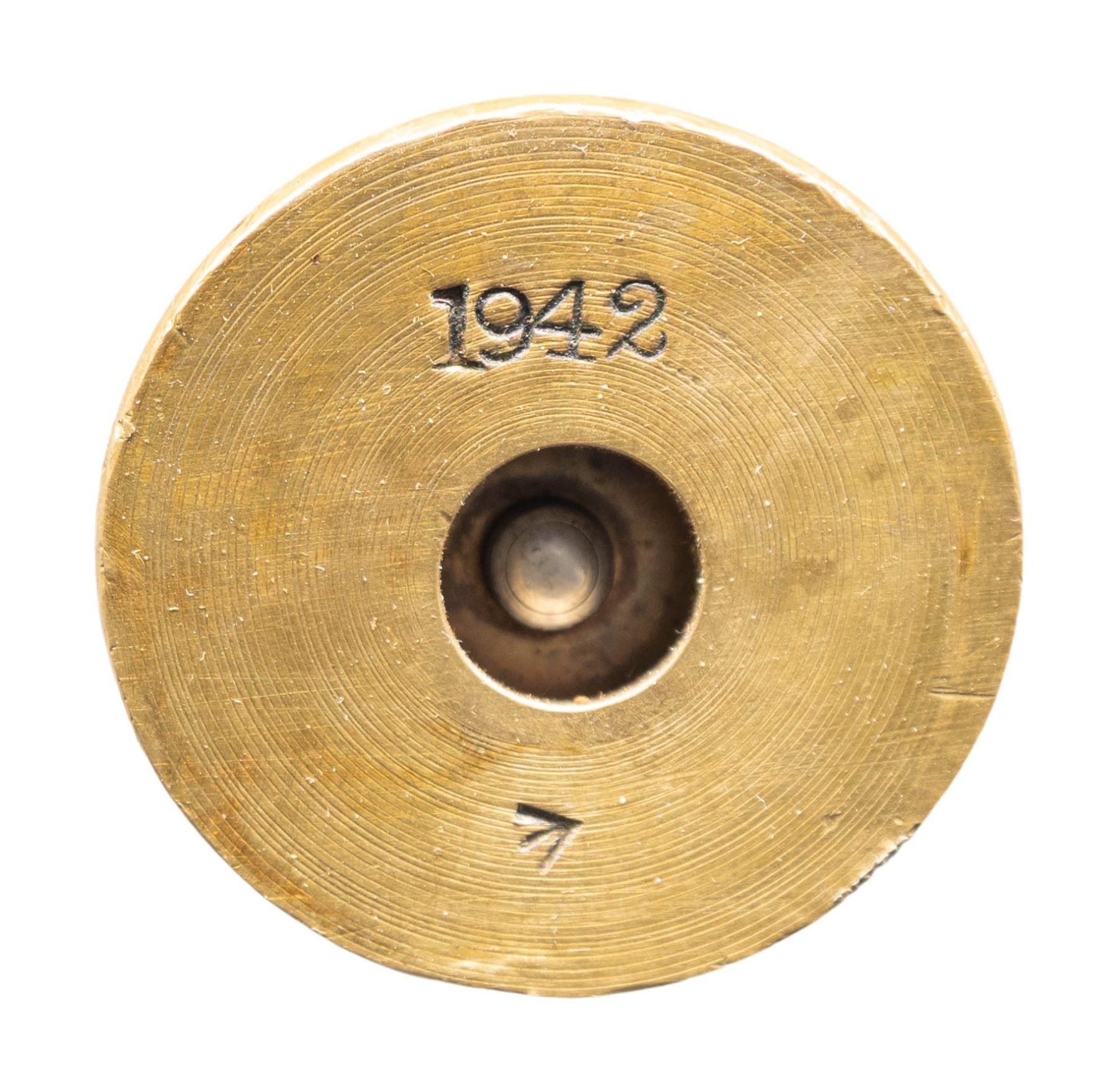 Cal. 310 Greener. S# 11199. Bbl. 4 3/4". 1942 dated & Broad Arrow marked Greener Horse Killer meant to put down injured livestock. Blued body & brass ends. UNATTACHED ACCESSORIES: leather case that has a a glue repaired strap & instruction sheet. CONDITON: brass parts are a dull yellow color with dings & tarnishing. Blued parts show light handling wear & marks. Case shows scattered crazing, flaing & age related wear. PROVENANCE: From the Buckstix Collection. (25-6331/MJC). CURIO. $800-1200.