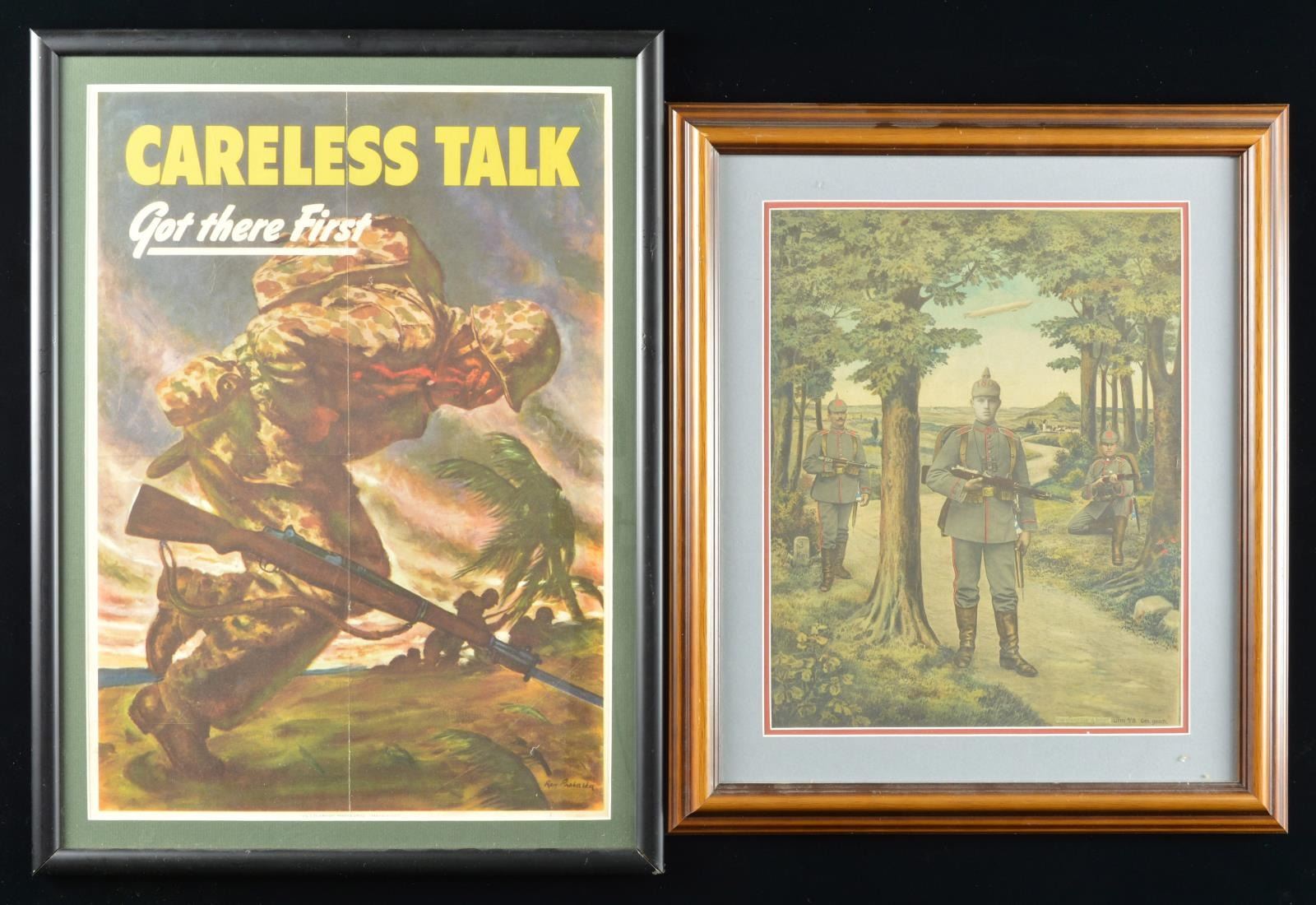 4) A WWII US poster measuring approx. 15” x 20 1/2" in a modern frame measuring 17 1/4" x 23”. Poster depicts a US Marine that has been shot in the face and abdomen while assaulting a beachhead. Poster reads “CARELSS TALK Got there First”. CONDITION: poster was folded in quarters at one time and creases show.