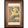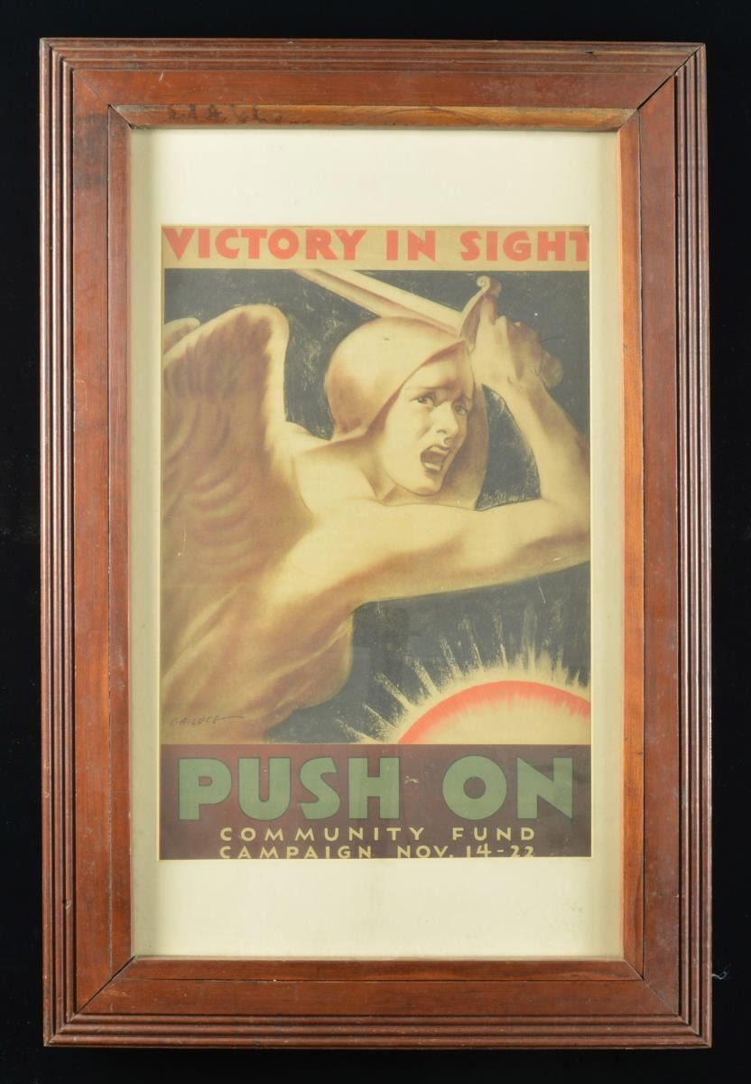 1) A WWI poster measuring approx. 13 1/2" x 19 1/2". Poster is depicting a winged Victory with a sword and the words “VICTORY IN SIGHT” & “PUSH ON COMMUNITY FUND CAMPAIGN NOV, 14-22”. Poster is housed in a large wooden frame measuring 19 1/2" x 29 1/2". CONDITION: poster has damage in the upper right corner and middle right side.
