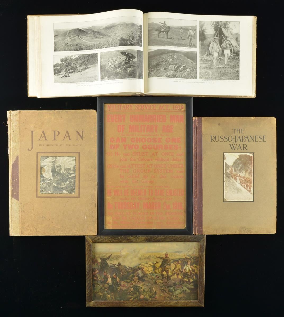7) 3 Large books on the Russo-Japanese War. Books are titled “A Photographic Record of the Russo-Japanese War”, “JAPAN HER STRENGTH AND BEAUTY”, and “THE RUSSO-JAPANESE WAR”. CONDITION: books generally show moderate wear overall.