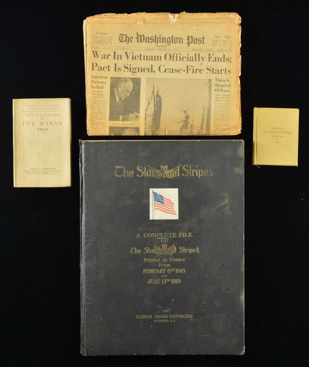 6) A large book measuring approx. 16 1/4" x 21 1/4" and 1” thick. The book is titled “The Stars and Stripes” & “A COMPLETE FILE OF The Stars and Stripes Printed in France From FEBRUARY 8TH 1918 TO JUNE 13TH 1919”. The base of the cover reads “NATIONAL TRIBUNE CORPORATION WASHINGTON, DC”. CONDITION: book shows light to moderate wear on the covers with minor damage to the spine.
