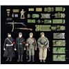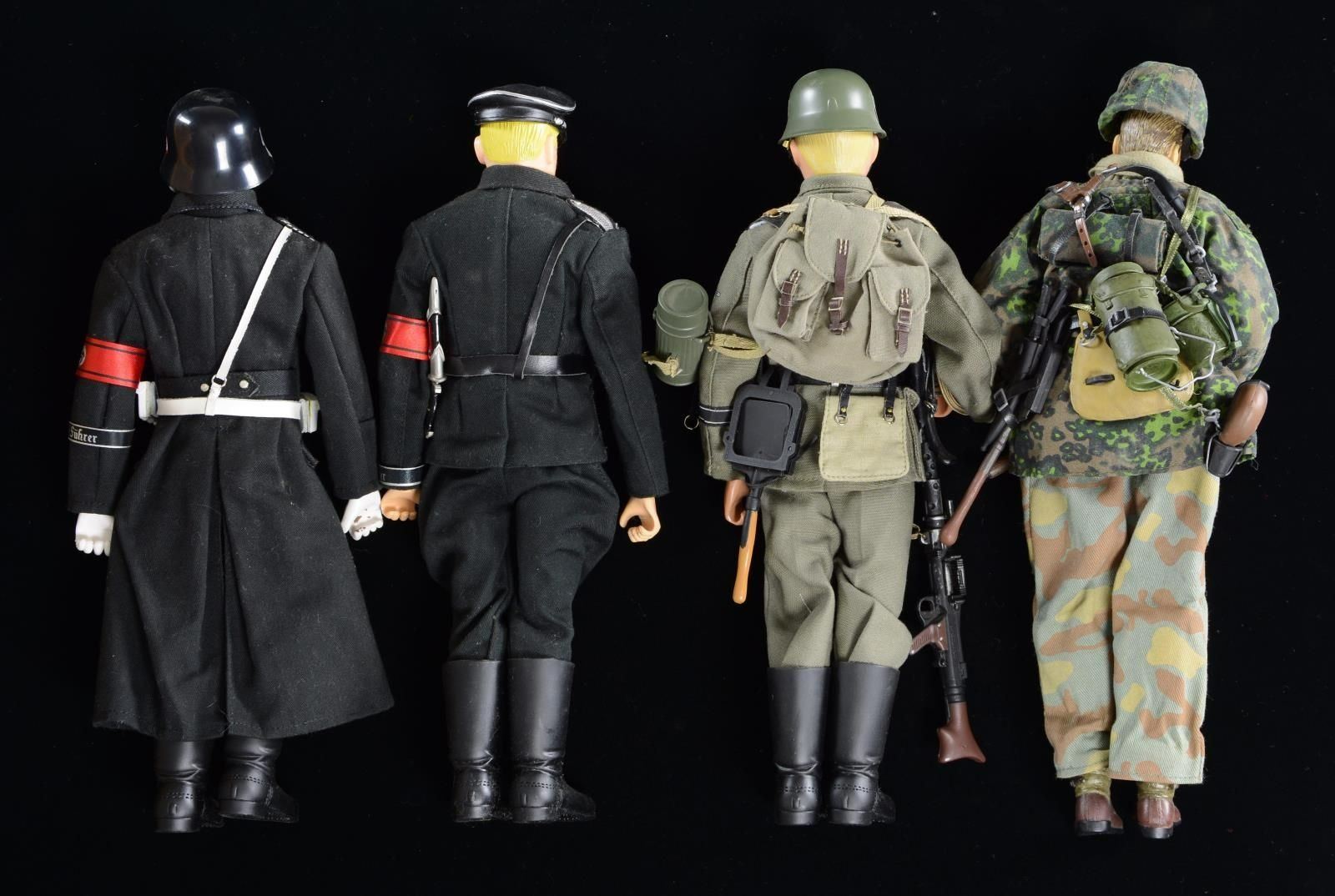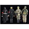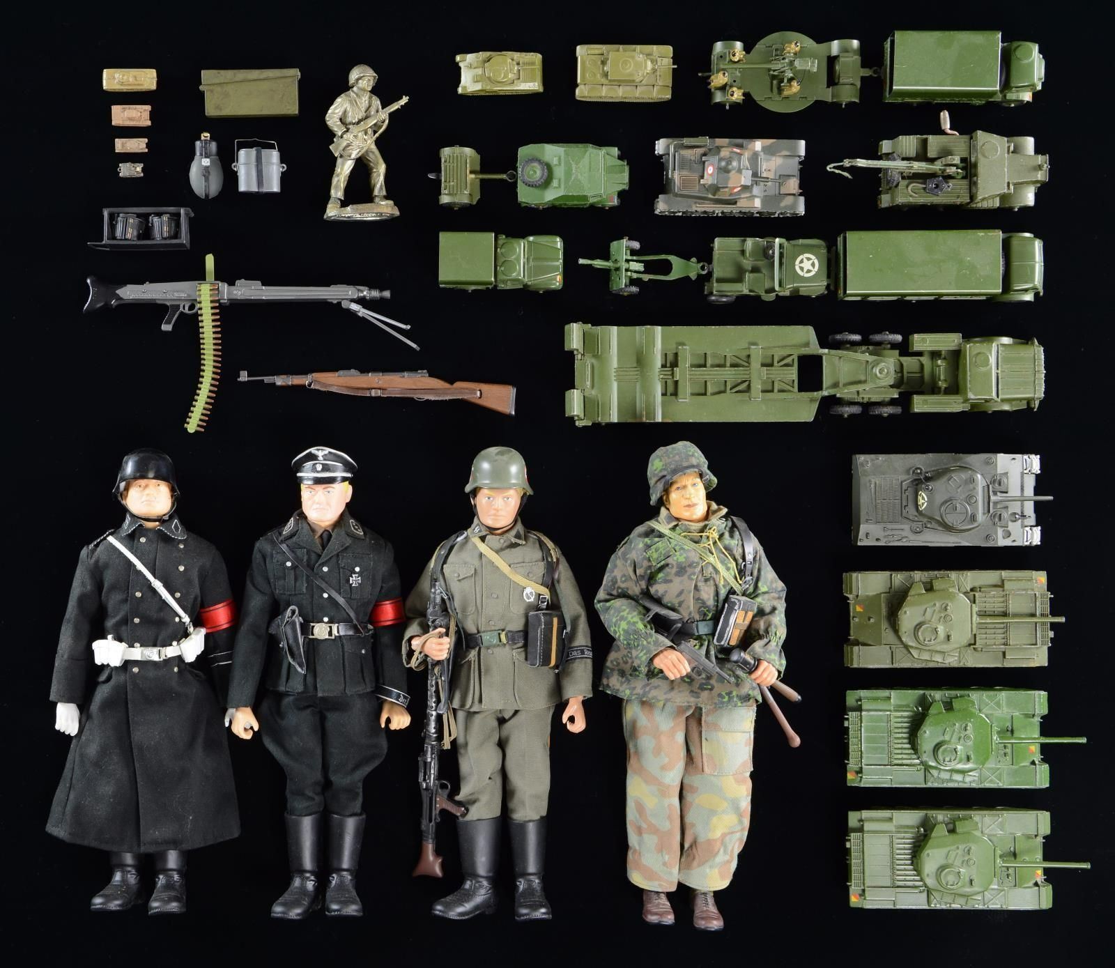 This lot consists of the following military themed toys: 1. FOUR 1/6 SCALE WW2 GERMAN FIGURES W/ ACCESSORIES. The first figure is a Das Reich infantryman w/ an MG34. The next is an SS Panzer grenadier w/ an MG42, P38 & grenade. The third figure is an SS soldier in a parade uniform w/ a K98k rifle. The last figure is an SS officer w/ holster & dagger. Also included are three black figure stands & two spare MG34 1/6 scale drums. CONDITION: figures show light to moderate wear. 2. VARIOUS MILITARY VEHICLE TOYS. About 19 military vehicle toys of various scales including M4 Sherman tanks, Centurion tanks, a Willy's Jeep, French R35 tank, various trucks & artillery pieces. Also included are four miniature tank models. CONDITON: fair to very good. 3. CAST WW2 US FIGURE. One 4" tall WW2 style GI cast figure w/ an M1 Garand made by Superior Models. CONDITION: good to very good. PROVENANCE: From the Lifelong Collection of Glen E. Mattox. (02-18697/MJC). $75-150.