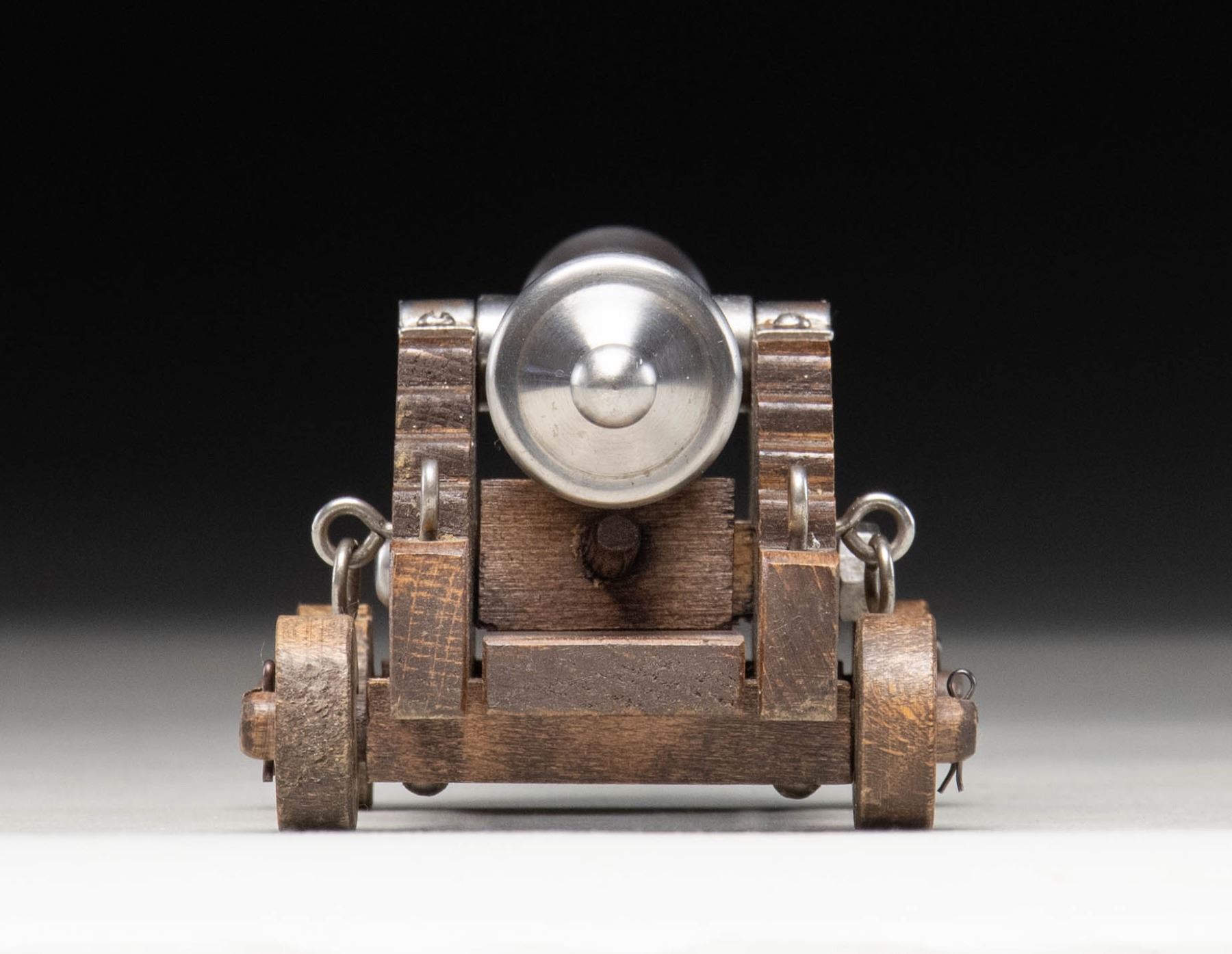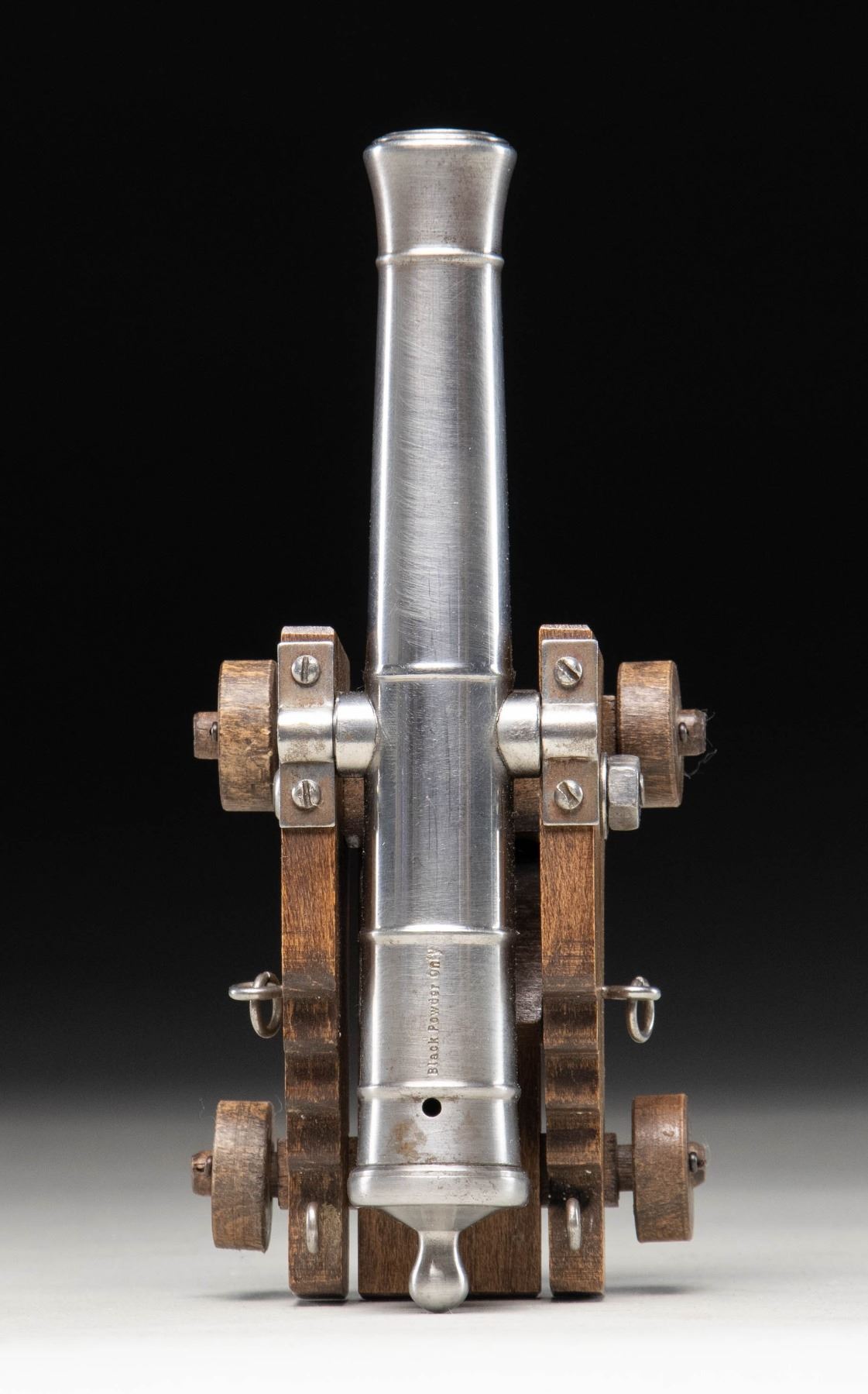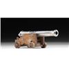 Cal. 45 Rifled. NSN. Miniature steel cannon mfg. in Spain. Top of the cannon tube is marked "Black Powder Only" between 2 bands, with "SPAIN" marked on the underside. Polished steel construction with 4 machined bands and flared muzzle. Cannon measures 7 7/16" from the muzzle to the end of the cascabell and 2 1/16" across the trunnions. Carriage is comprised of wood, featuring steel trunnion bands and fittings, with wooden wheels, and is accompanied by a wood elevation quoin. CONDITION: cannon and steel carriage fittings retain a mostly bright appearance, with scattered superficial handling marks and some spots of age related discoloration. Trunnion straps exhibit light surface oxidation. Wood carriage is very good overall. (01-28210/MLW). ANTIQUE. $50-100.