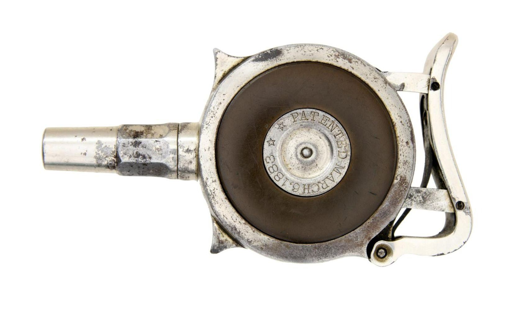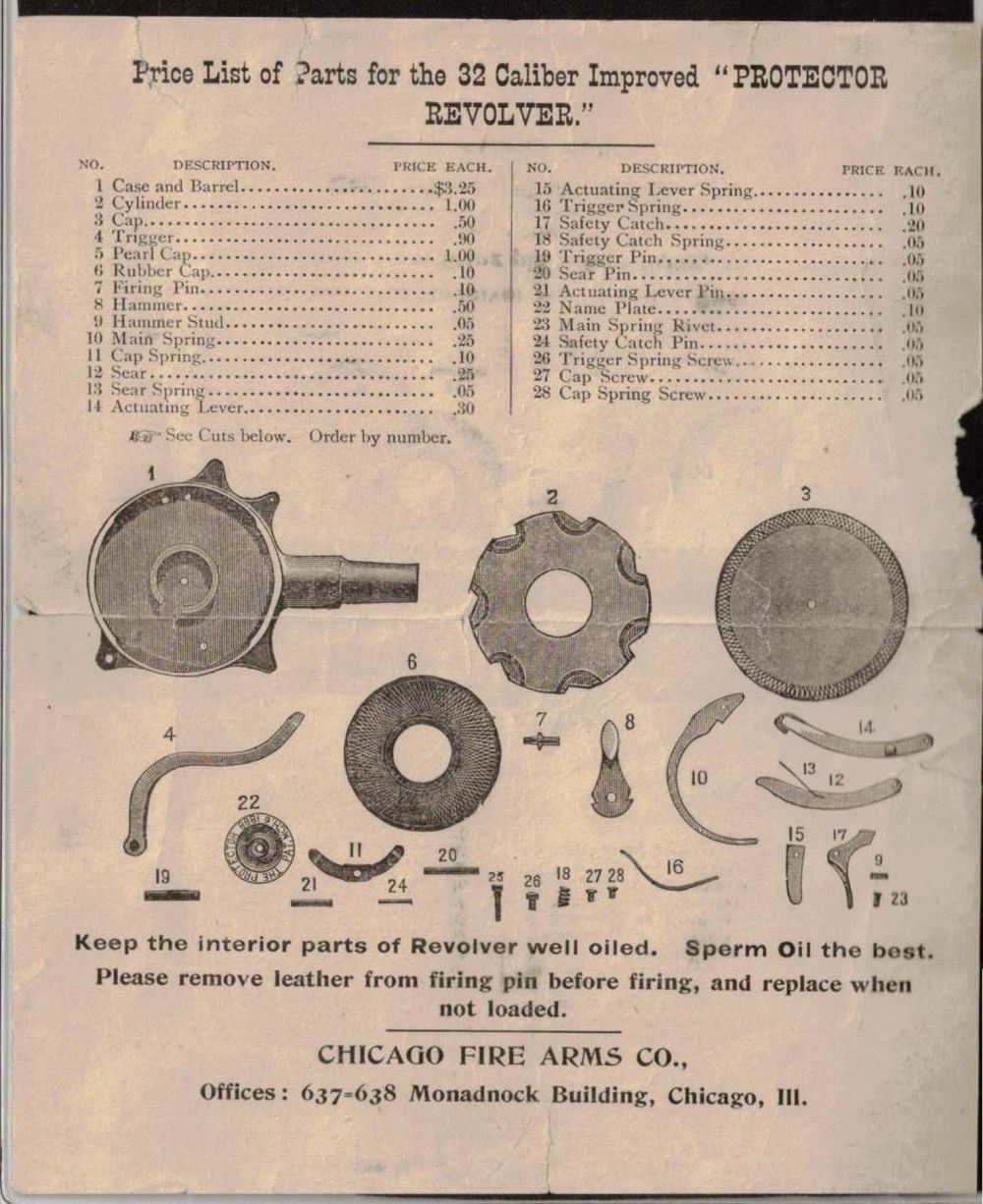 Cal. 32 CF. S# 1294. Bbl. 1 3/4". One of 3,000 Mfg. circa 1891-1892. Visible S#s match. Seven shot internal rotary chambers which must be removed to reload. Nickel finish w/ hard rubber side plates. A smaller & simpler version of the more recognizable Chicago Palm Pistol. UNATTACHED ACCESSORIES: original advertisement price list of parts. CONDITION: action does not function. Metal retains about 40% nickel plate w/ scattered deep scratches, dings, dents & spots of pitting. Grips are well worn. Bore is strongly rifled. PROVENANCE: From the Lifelong Collection of Glen E. Mattox. (01-22433/CW). ANTIQUE. $1,200-1,500.