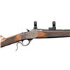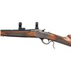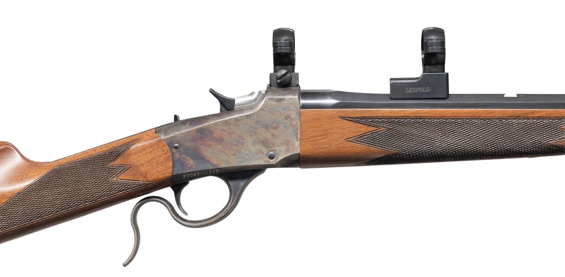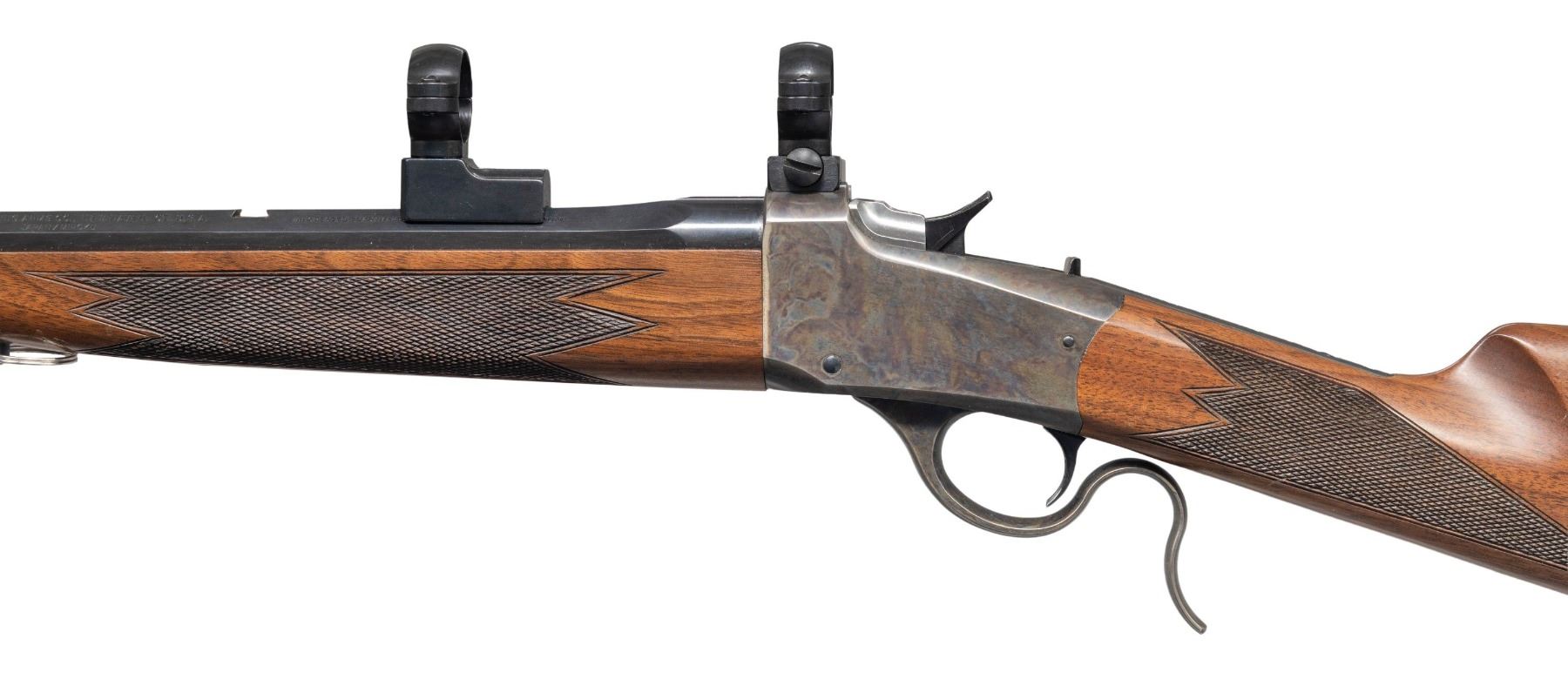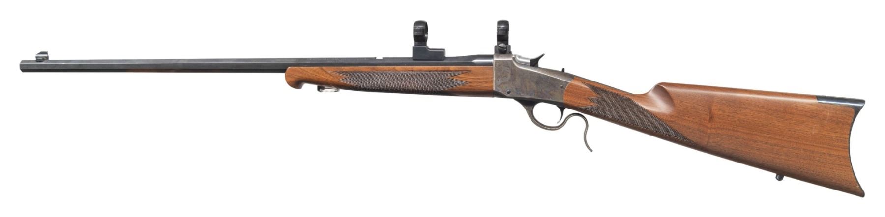 SINGLE SHOT BREECHLOADING RIFLE. Cal. 17 HMR. S# 00768MX85E. Bbl. 24". Model 1885 Low Wall single shot breechloading rifle mfg. in Japan by Miroku for Winchester. The left quarter flat of the octagonal bbl. is marked with the Winchester trademark logo (repeated on upper receiver tang), followed by Winchester's importer information and "JAPAN/MIROKU", with the cal. designation marked on the right quarter flat. Right side of the receiver is marked with the S#. Frame, lever, and buttplate exhibit a case colored finish, with the bbl. exhibiting a blue finish. Breechblock is polished in-the-white. Checkered wood schnabel tip forearm and straight grip stock with sling eyes. High profile brass beaded blade front sight. Rear sight dovetail is empty. Receiver and bbl. are fitted with scope rings. UNATTACHED ACCESSORIES: plastic bag containing a manual, rear sight, and sling swivels. CONDITION: excellent, with metal components retaining virtually all of their original factory finishes overall. Left forward edge of the receiver exhibits some fading. Mirror bore, exhibiting a small patch of what appears to be light to mild surface oxidation or grease, while retaining well defined rifling throughout. Proper manual mechanics. Wood furniture shows some scattered superficial marks and scratches, but otherwise remains sound. PROVENANCE: From the PMRB Collection. (25-5858/MLW). MODERN. $500-800.