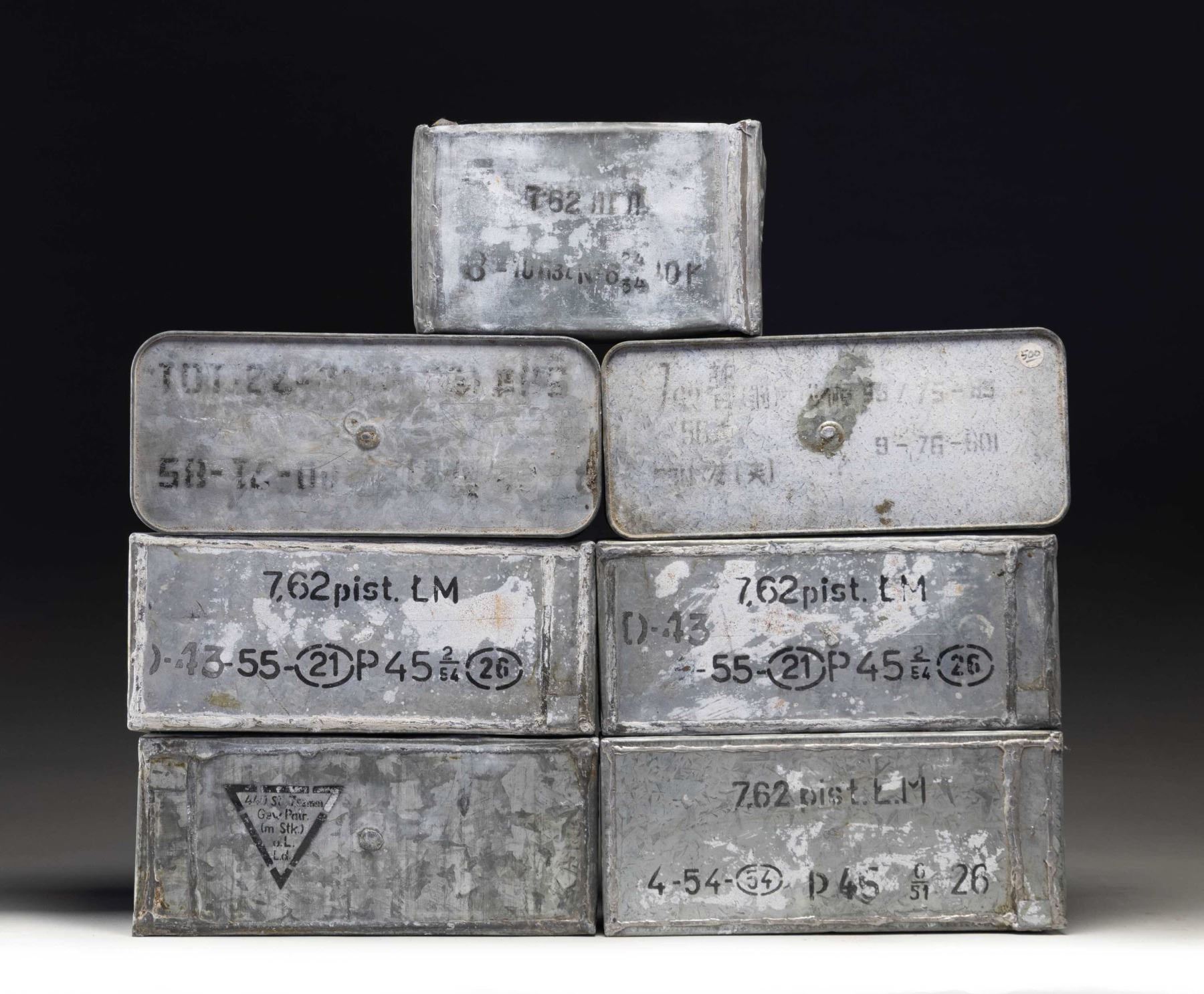 This lot consists of the following sealed Com-Bloc ammo cans: 1) Three 1620 rd. cans of Polish 7.62x25 Tok ammo. 2) One 440 rd. can of East German 7.62x54R ammo. 3) One 550 rd. can of Chinese 7.62x39. 4) One 300 rd. can of Bulgarian 7.62x54R. 5) One unknown spam can that has faint markings that appear to read "TOT-22" & "58-TZ-00". CONDITION: ammo cans are sealed & show varying degrees of oxidation & age wear. (02-26094/MJC). AMMO. $500-700.