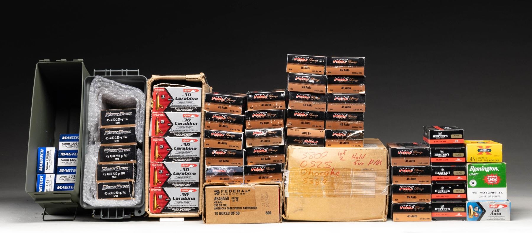 This lot consists of the following ammo: 1) 300 rds. of Magtech 115 gr. 9mm Luger FMJ housed in GI 30 cal ammo can. 2) 500 rds. of of American Eagle 45 ACP 230 gr. FMJ ammo. 3) About 1500 rds. of varied 45 ACP brass 230 gr. FMJ ammo. 4) 500 rds. of Aguila 30 Carbine 110 grain. FMJ. These ammo boxes show notable storage damage. 5) 500 rds. of Blazer Brass 45 ACP 230 gr FMJ housed in green aftermarket ammo cans. CONDITION: very good or better. (02-25592-2/MJC). $500-1000 for lot.