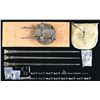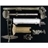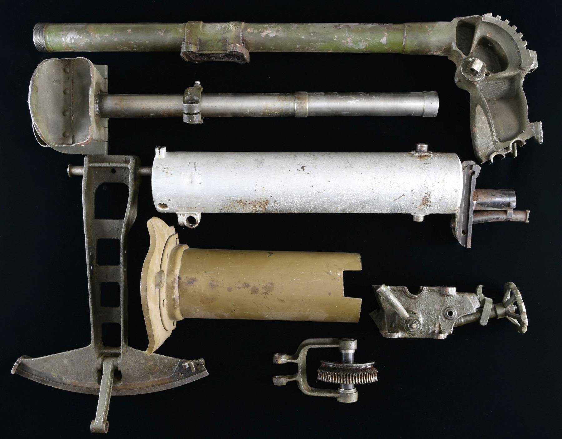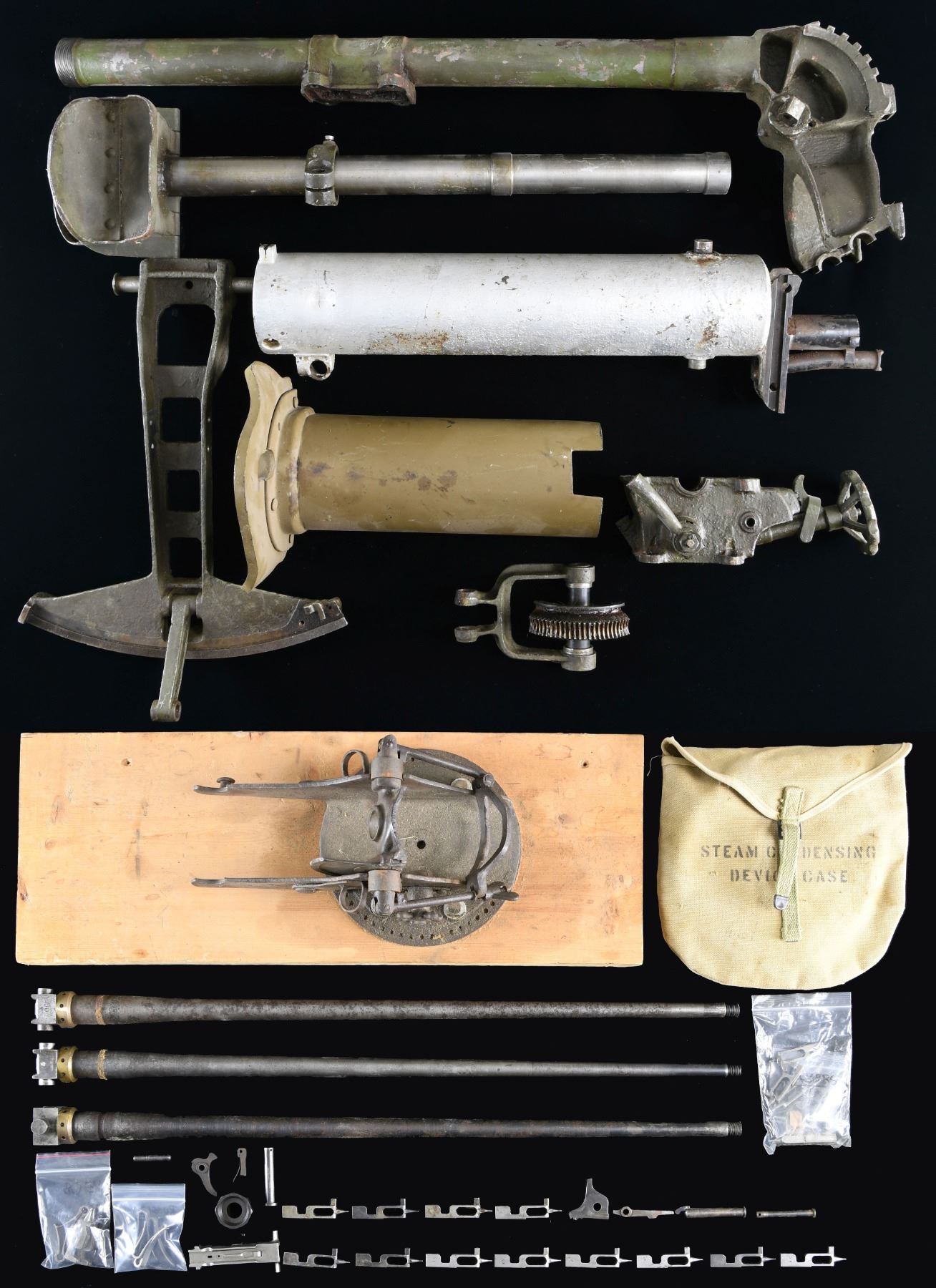 This lot consists of the following parts: 1) Three Imperial German proofed MG08 bbls. 2) MG08 Expedient Trench Mount. Mount is on a modern hardwood base & has a green paint. 3) Browning 1917 steam condensing carrying case & hose. 4) Eight Vickers MG firing pins. 5) Eight Russian M1910 Maxim firing pins. 6) MG08 Bbl. jacket. Jacket is painted silver, it shows scattered flaking, oxidation & some battle damage. 7) The body from an MG08 water jacket armor. Armor has a green paint. 8) Part of an unknown Maxim tripod including the T&E unit, part of the rear leg & front legs. Tripod has green paint with scattered oxidation & flaking. PROVENANCE: From the Lifelong Collection of Brian Linde. (02-23926-11/MJC). $1000-2000.