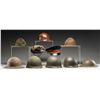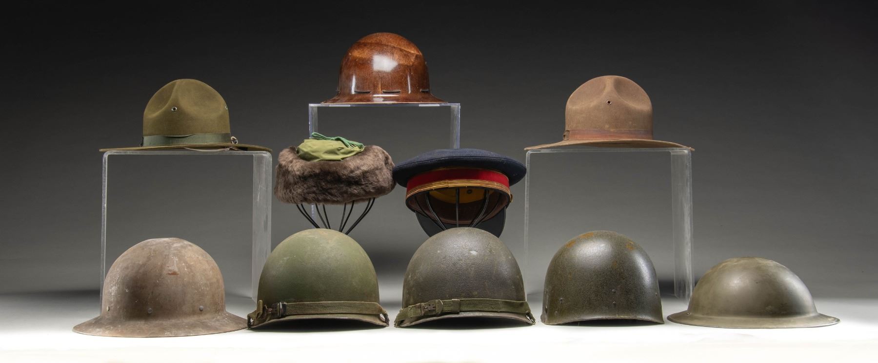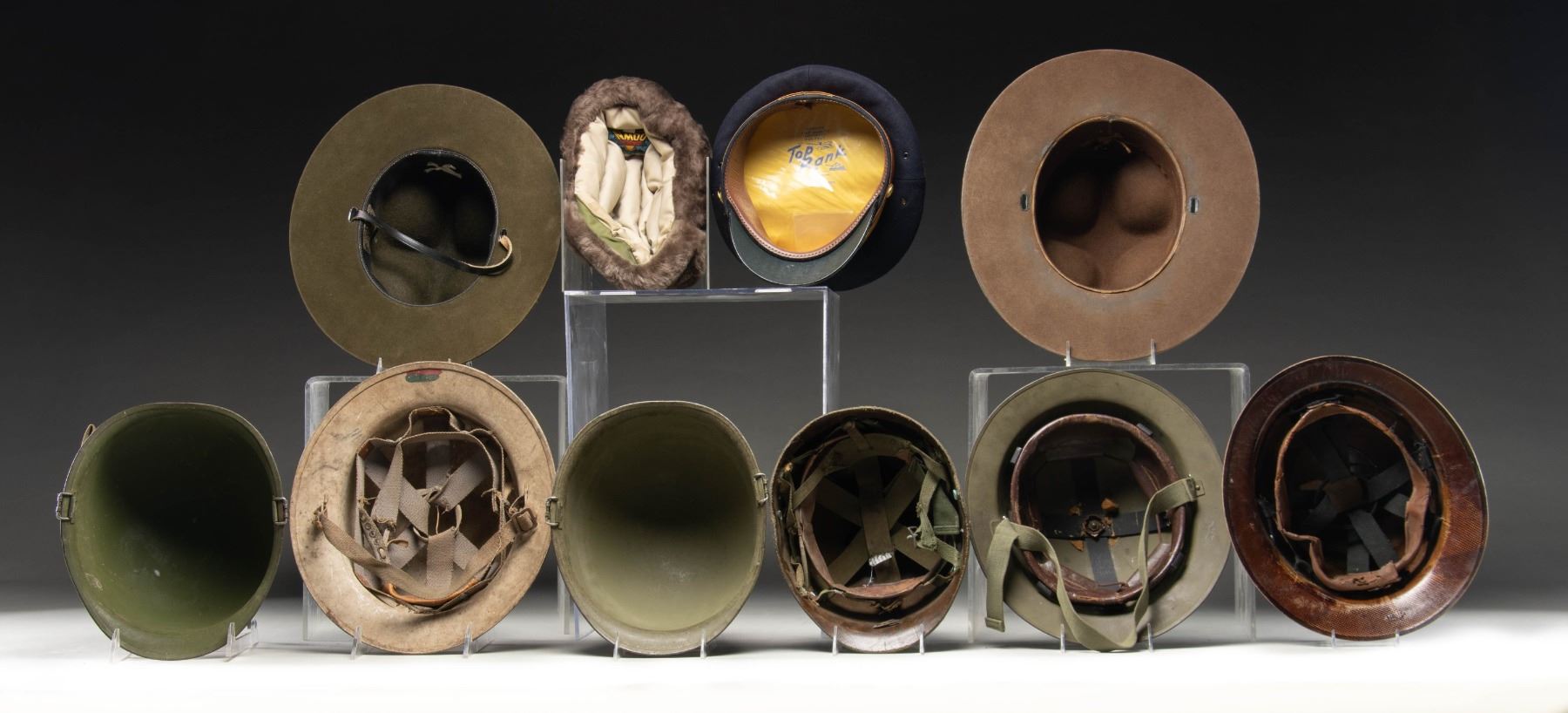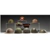 This lot consists of the following items: 1) USMC Bauer Down Winter Hat. Small size with USMC emblem on front flap. 2) Top Rank Army Cap. No rank insignia present. 3) USMC DI Hat. USMC emblem on front. Inside marked "USMC AZ". 4) Unmarked Campaign/DI hat. Made by Stratton of Chicago. 5) Two rear seam M1 Helmet Shells. Swivel bails & green canvas chinstraps. No liners or markings present. 6) Belgian Issue Brodie Helmet. Green painted Brodie helmet with painted Belgian flag. Leather leather & canvas chinstrap present. 7) Unmarked M1 Helmet Liner. Liner assembly for M1 helmet. 8) Unmarked Gray Brodie Helmet. Liner & chinstrap present. 9) MSA Liner. Chinstrap & complete liner assembly. CONDITION: items show varying degrees of oxidation, age, scuffing & related wear. (02-24207/MJC). $300-500 for lot.