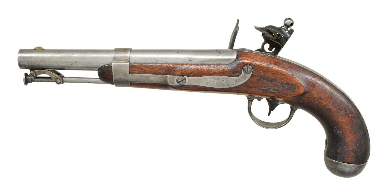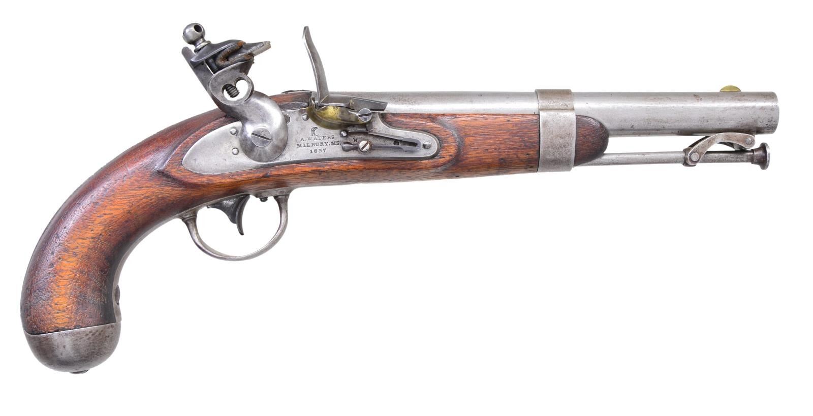Cal. 54 S# NSN. This early production pistol is in standard configuration with 8 1/2" barrel stamped "U.S." "JA" "P" at rear and is fitted with bridled steel ramrod. Oval rear sight is on barrel tang. Flintlock with flat beveled lockplate has round tail and is fitted with reinforced cock, inset brass pan, bridled frizzen and feather spring with bulbous finial. Center is stamped with eagle head and "A. WATERS" "MILBURY. MS." "1837". Walnut stock is iron mounted. Sideplate is integral with barrel band. Grip cap has long back strap extending to barrel tang. Inspectors marks are on left side opposite lock. CONDITION: good, original flint. Metal parts show cleaning to silver gray, markings remain clear. Stock refinished and shows many sanding marks. Inspectors marks are good. Bore is lightly pitted. Mechanically fine. PROVENANCE: From the Lifelong Collection of Glen E. Mattox. (01-22405/MGM). ANTIQUE. $1,200-1,800.