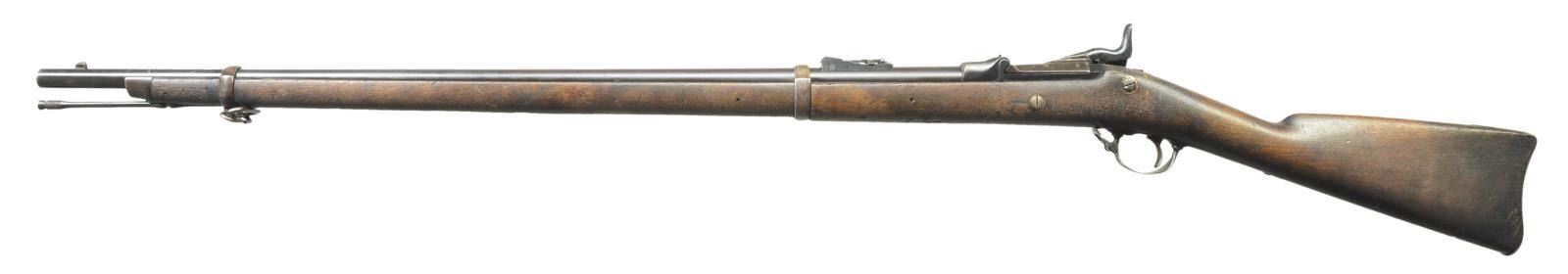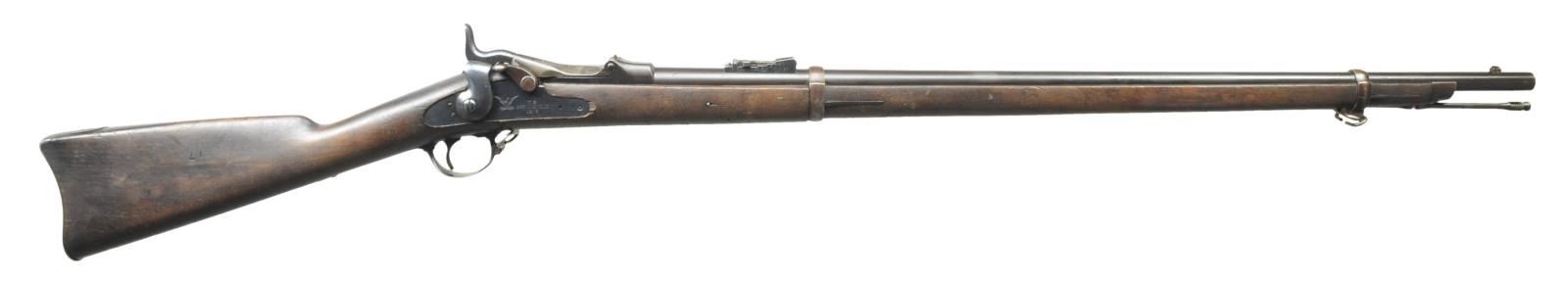 Cal. 45-70. S# 13430. The 32 1/2" bbl. w/ stepped rear sight has early style thin action w/ 1873 dated high arch breechblock, has S# at rear. Blued Springfield lock is not dated. Stock w/ short comb is iron mounted & has circled "R" proof behind trigger guard & the initials "LGW". CONDITION: good to very good w/ traces of blue on bbl. which is mostly brown patina. Some color hardening remains on breech block & lock retains most of its original blue. Stock retains most of an old oil refinish w/ many marks. Bore is very good to fine w/ some light scattered pitting. Mechanically good. (01-20345/MGM). ANTIQUE. $500-800.