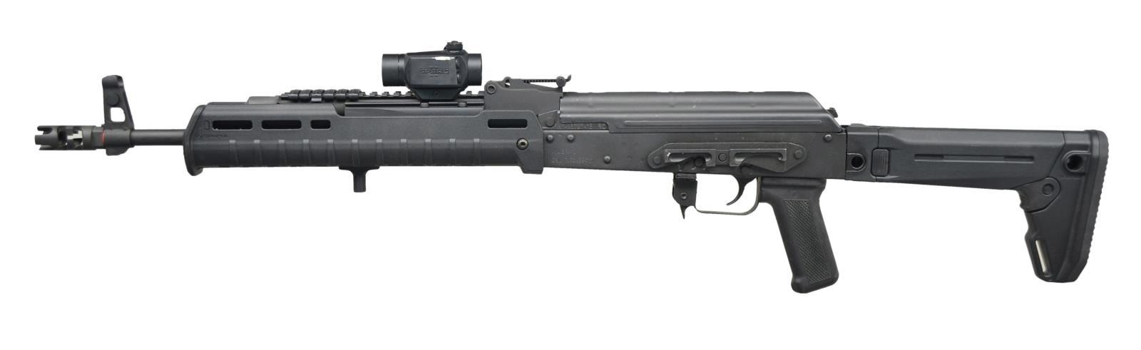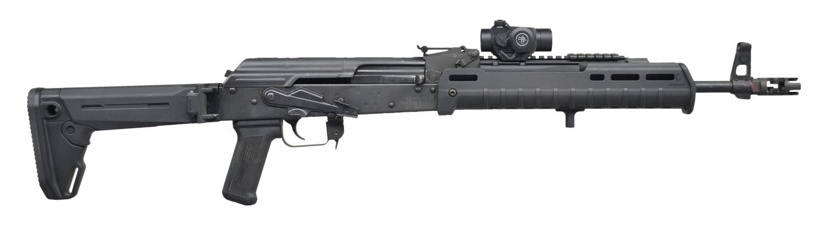Cal. 7.62x39mm. S# A1-48797-16 RO. Bbl. 16". A Romanian imported AK-47 family member from CAI in Georgia, VT. This package has been modernized to a useful platform by replacing the furniture w/ current technology such as the following; the original small wooden handguard has been replaced w/ a plastic forend that doubles the real estate you can handle to manipulate it, the top of the forend has been replaced w/ a 6" section of picatinny rail for optic mounting & currently sporting a Vortex Sparq II red dot sight. The short wooden stock has been replaced w/ a plastic Magpul Zhukov-5 folding / collapsible stock. Factory left-side receiver QC scope mount. Upgraded muzzle brake. The entire gun is a clean matte black in finish. CONDITION: finish coverage is complete & consistent w/ only light thinning in a few areas of mechanical intervention. Vortex sight appears to work correctly. Bore is bright. Fire control mechanism appears to function correctly when cycled by hand. (22-3816/JZ). MODERN. $600-900.