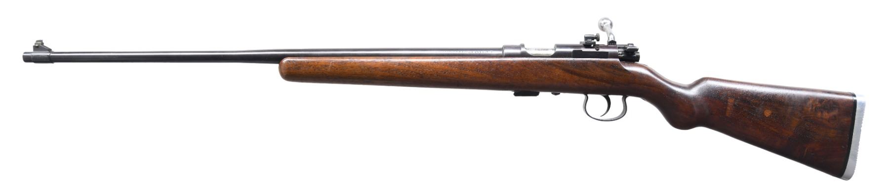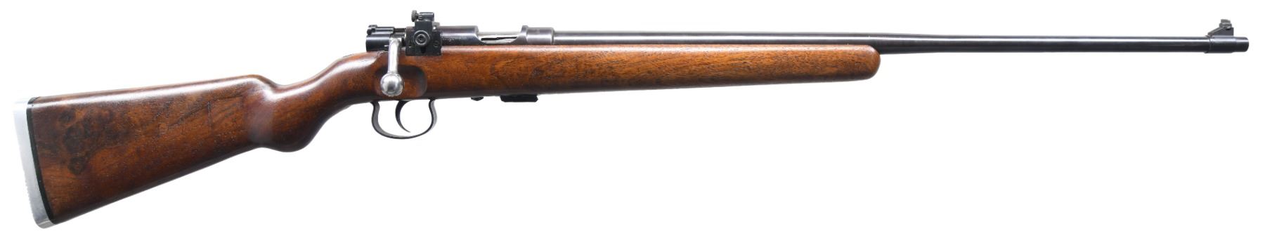Cal. 22 LR. S# 251234. Bbl. 26". Ramped blade front sight. Receiver mounted unmarked aperture rear sight. Modified WW2 German Gustloff KKW bolt action training rifle with multi-rd. mag. As originally made this rifle resembled a K98k & was a single shot bolt action. Due to these modifications rifle is no longer curio. Rifle has WW2 German eagle "N" commercial proofs & matching electropencil number on bolt handle. Reblue finish with bright bolt handle & body. Cutdown walnut stock with added grooved buttplate. Both sides of butt have a couple neatly patched holes. MAGS: 1-5 rd. that appears fixed. CONDITION: stock has added finish with a few scattered plugs on butt, a couple light chips, scattered dings & handling marks. Metal retains 97% reblue with some light handling marks & light oxidation specks. Action functions properly when hand cycled. Very good bright bore. (24-7154/MJC). MODERN. $200-400.