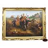 The sight size of this attractive oil painting is 53 1/2" x 37 1/2", and the frame size is just over 63” x 47 1/2". The vividly colored painting depicts a confrontation between two lions, four safari hunters, two elephants, and several native guides with their dogs. In the center of the foreground is a large elephant with a tiger climbing its neck to reach the native mahout. In the howdah are two wide-eyed hunters, one of which is shooting the tiger with what appears to be a shotgun. To the left is another elephant grasping a tiger around the midsection in an attempt to dispatch the striped beast. The mahout appears calm while the two other hunters, perched in the howdah, watch intently. The right side shows several guides with long lances, many of which are on horseback. There are also two dogs depicted, presumably used to aid in the hunt. The lower left shows a gravely wounded guide and another on a rearing, frightened horse, grasping his lance and planning an attack on the center tiger. The scene takes place in a grassland area with a neighboring village dotted by palm trees. A fine painting capturing the urgency of the moment and showing accurate depictions of the indigenous people, as well as the classically attired, likely British, hunters. The impasto is light, and the expert use of color contrast is admirable. The gold-painted frame is in an early 19th century style but obviously a modern production. CONDITION: the painting shows no fading with vivid colors. There are no holes or abrasions to the canvas. The frame is solid with minor restoration work to the gold gilt. PROVENANCE: from the renowned collection of quality sporting arms from Lewis Drake together with inventory of Lewis Drake Associates. (02-24329/BF). $2,000-4,000.