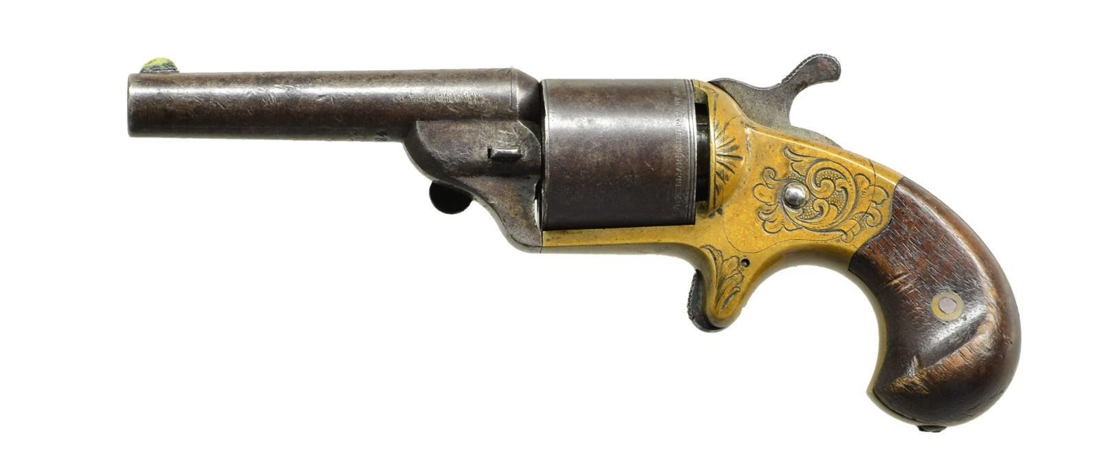 Cal. 32 Teat-Fire. S# JH34 / 28434. Bbl. 3 1/4" round with brass blade; retained to frame by wedge. Mfg. 1864-1870 by Moore's Patent Firearms Co. and National Arms Co.(approx 30,000 units for all variations); this is last produced variation is by National (approx. 7,000 units) with hooked extractor on right side of frame plus National Firearms markings on barrel and Williamson's patent markings on 6 rd. cylinder. Left side of frame under smooth bird's head walnut grips has "JH34" plus "28484" on underside of barrel. Created as attempt to circumvent Rollin White patent held by S&W and was S&W's main competitor prompting Colt to buy National Arms in 1870. Brass frame with light decorative engraving. CONDITION: good appearance with patina tone throughout; light impact marks on bottom of barrel. Good grips with handling marks (mostly on left). Proper mechanical functioning. Poor pitted bore with barely visible rifling. (01-22151/NW). ANTIQUE. $350-500.