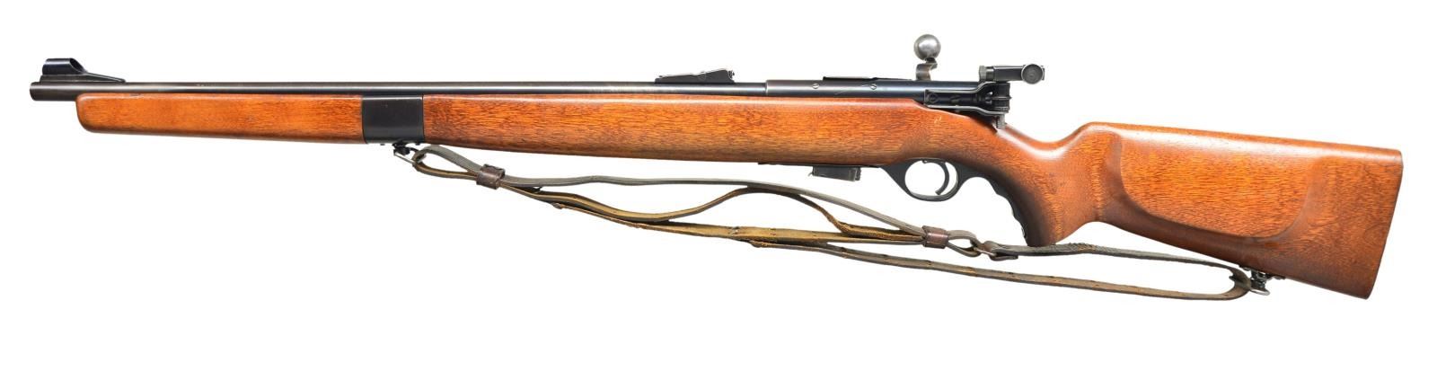 Cal. 22 S-L-LR. NSN. Bbl. 23". Mfg. 1940-1944. Bolt action target rifle w/ detachable magazine. Full length wood stock w/ trap door in butt plate. Hooded post front sight & Mossberg S-130 rear receiver sight. Also has standard elevation adjustable rear sight mounted on barrel. Blued finish on exposed metal surfaces. Sling swivels front & rear w/ brown leather sling. Extended trigger guard w/ finger grooves. MAGS: 2 steel 5rd. CONDITION: original finish is complete & consistent, thinning on rear portion of barrel, w/ light scratches in area of standard rear sight & on dust cover. Bright bore w/ descent rifling. (22-5965/JZ). CURIO. $150-250.