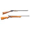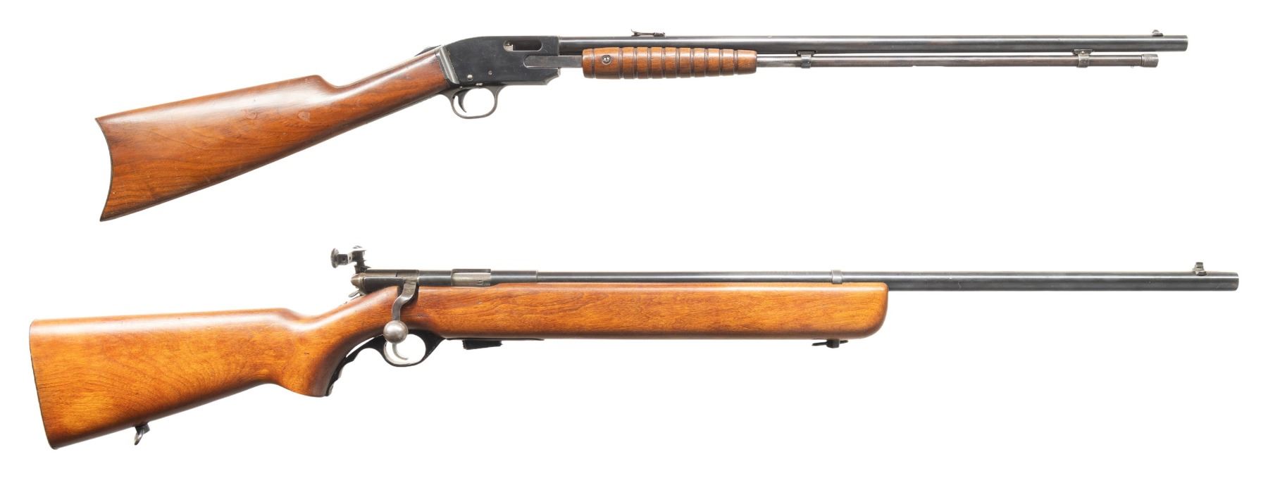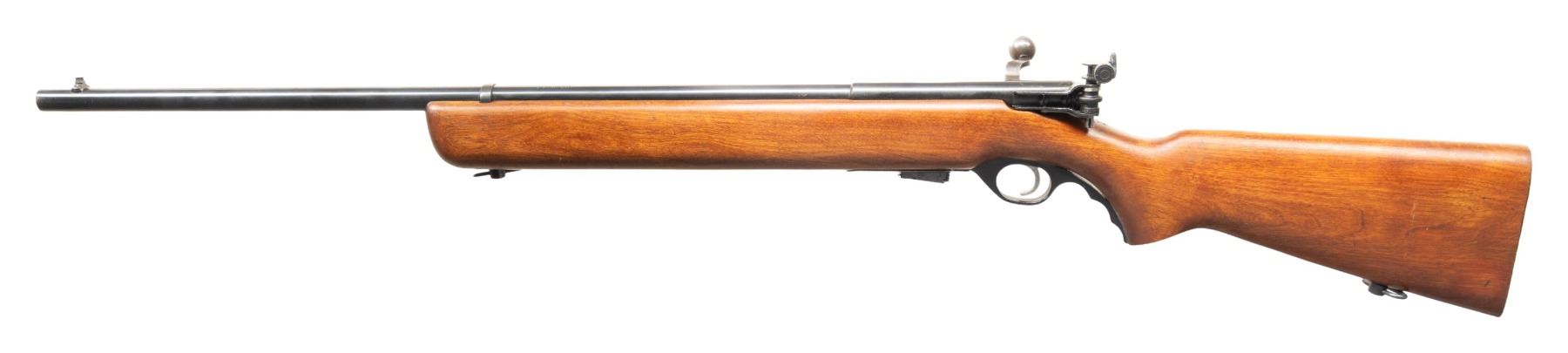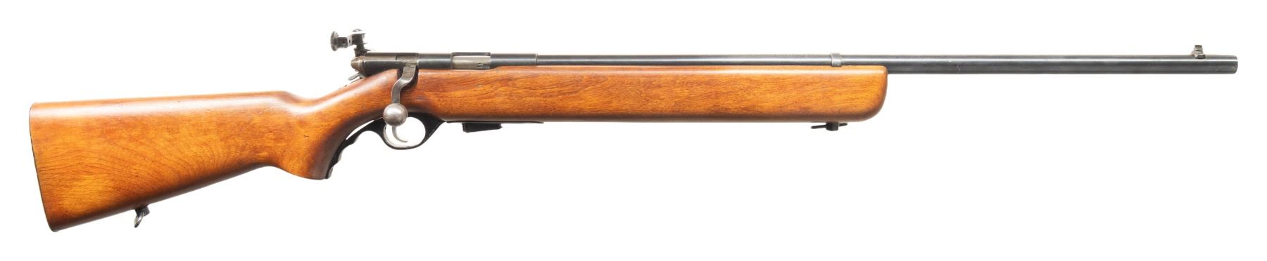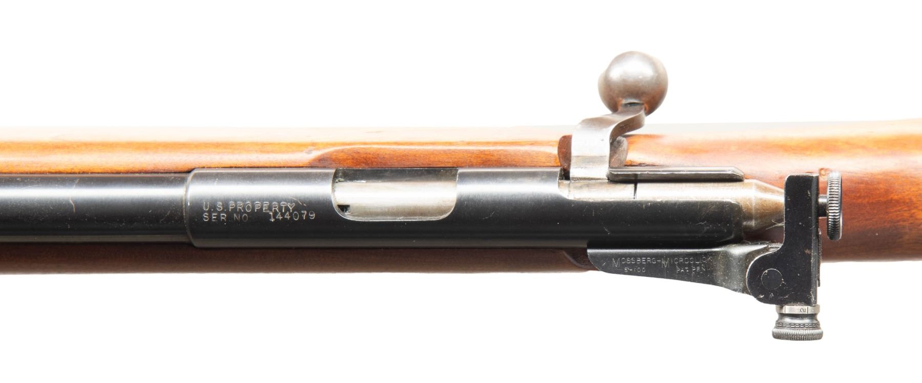 2) MOSSBERG 44 US BOLT ACTION TRAINING RIFLE. Cal. 22 LR. S# 144079. Mfg. 1943-1944. Bbl. 26". Blade front sight & Mossberg Microclick S-100 aperture receiver sight. Top of receiver stamped "US PROPERTY". Hardwood stock w/ sling swivels & grooved buttplate. MAGS: 1 - 7 rd. CONDITION: Very good blue with light pinprick oxidation & edge wear. Very good wood finish with light marks. Very good rifling. PROVENANCE: From the PMRB Collection. (25-5932/MD). ALL CURIO. $600-900.