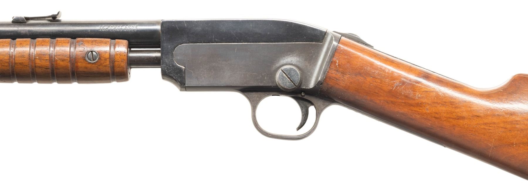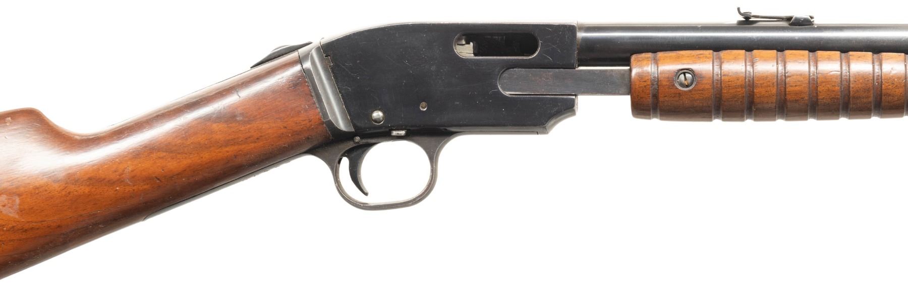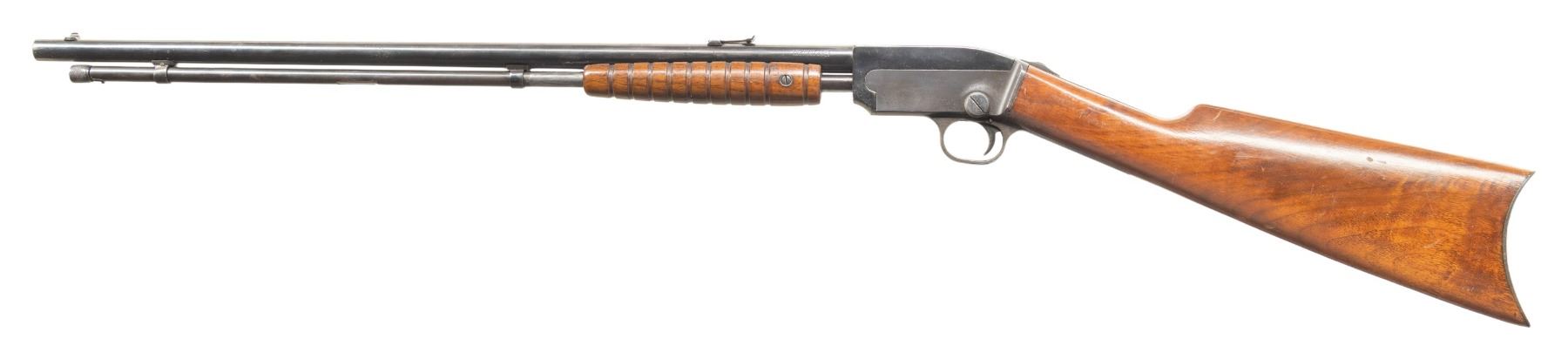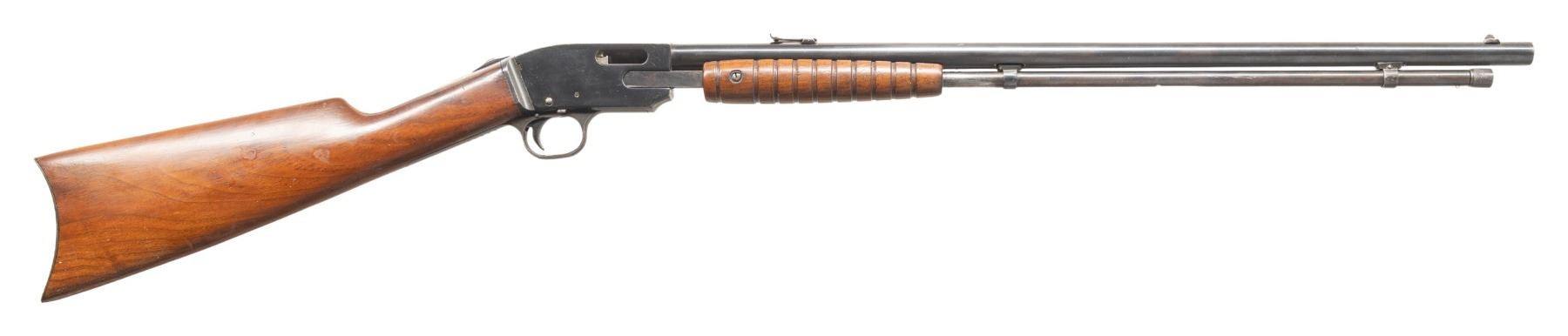 1) MOSSBERG K PUMP RIFLE. CAL. 22 S, L , LR. S# 26470. Mfg. 1922-1931. Bbl. 22" w/ sporting open sights. Additional "HECKMAN ARMS CO" stamp near barrel address. Tubular mag. Takedown action. Walnut stock set w/ crescent buttplate. CONDITION: reblued metal has good appearance with wear & marks. Sanded & refinished wood shows marks. Very good rifling with light pitting near muzzle. (25-5927/MD).