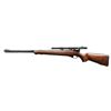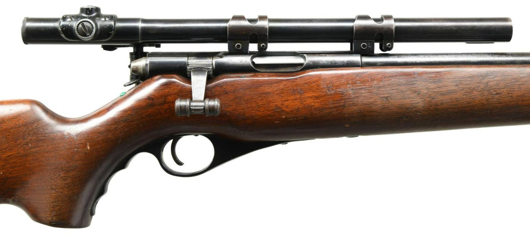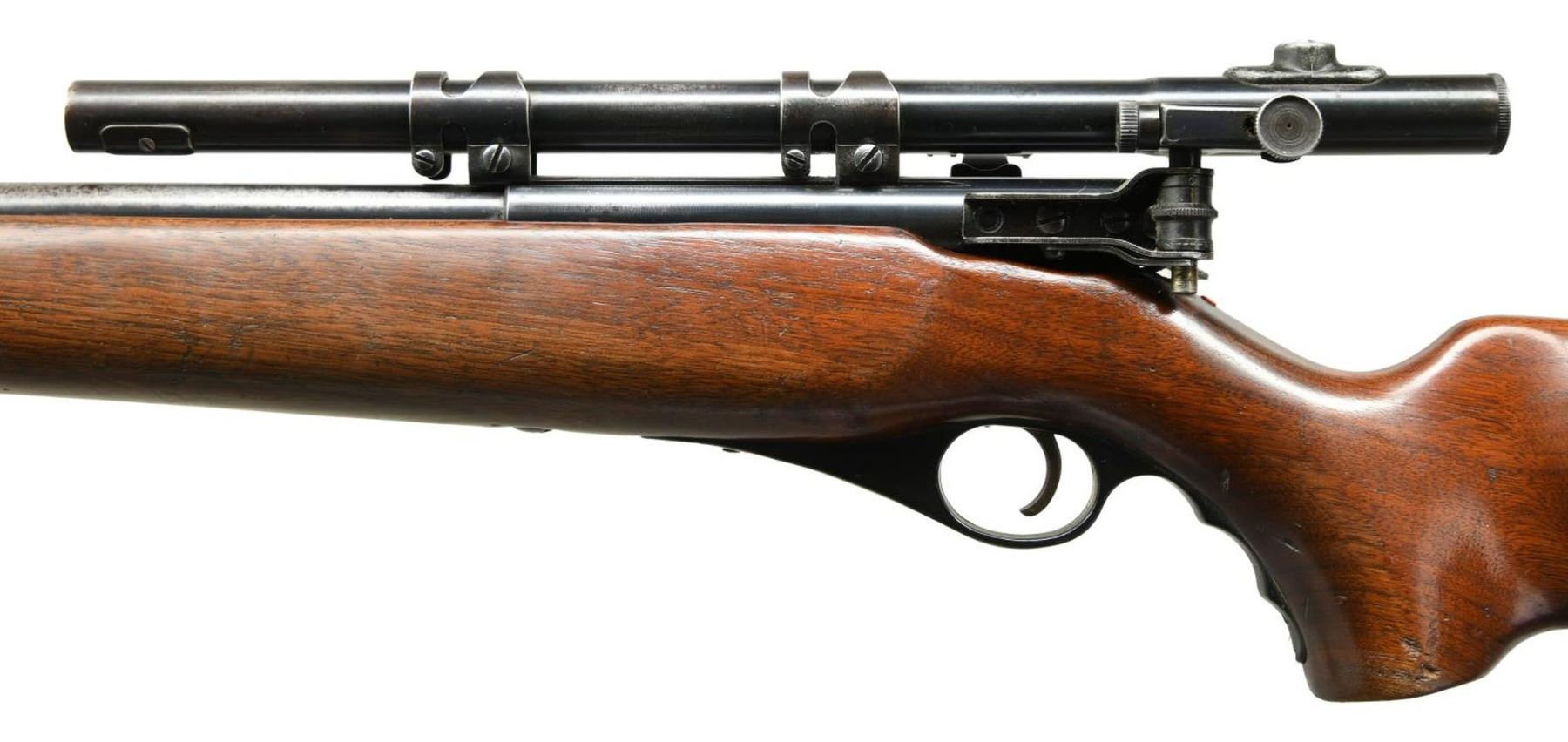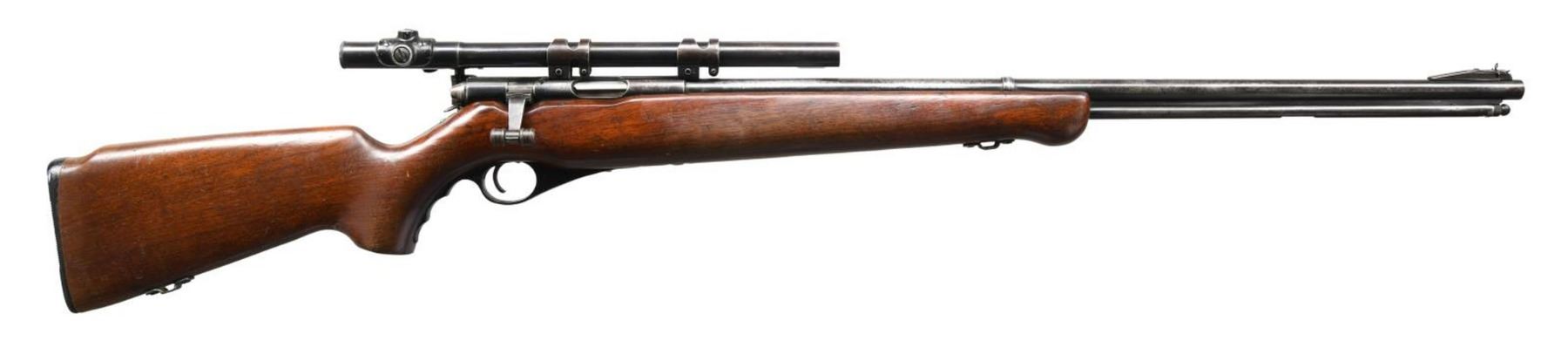 Cal. 22 S, L, LR. NSN. Bbl 26". Model 146B bolt action rifle manufactured by Mossberg. top of barrel bears the manufacturer information, as well as the model and caliber designations. Blued finish with 1 piece wood stock. Black plastic trigger guard. Mossberg No. M4D 4x scope. Side-folding aperture rear sight, with ring front sight. Firing pin is not present. CONDITION: metal components retain fair amounts of their original factory blue finish, exhibiting wear and thinning through to gray patina overall. Right side of receiver exhibits some mild pitting. Very bright bore, exhibiting strong rifling throughout. Stock shows some scattered marks and minor impressions from storage and handling, but otherwise is good overall. Scope retains a clear image, with some black spotting at the right and bottom of the optic. (23-2575/MLW). CURIO. $200-300.